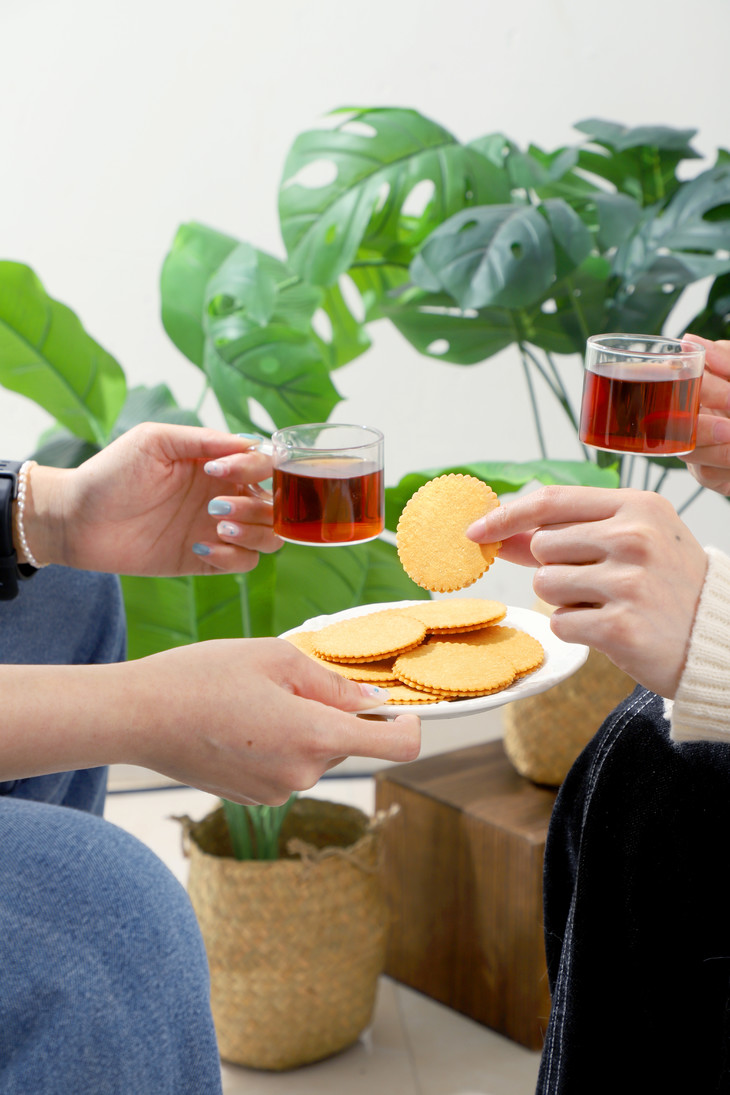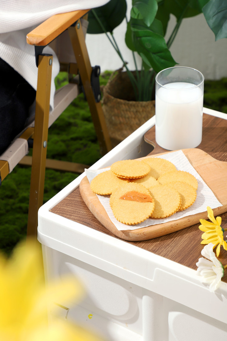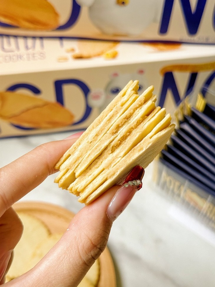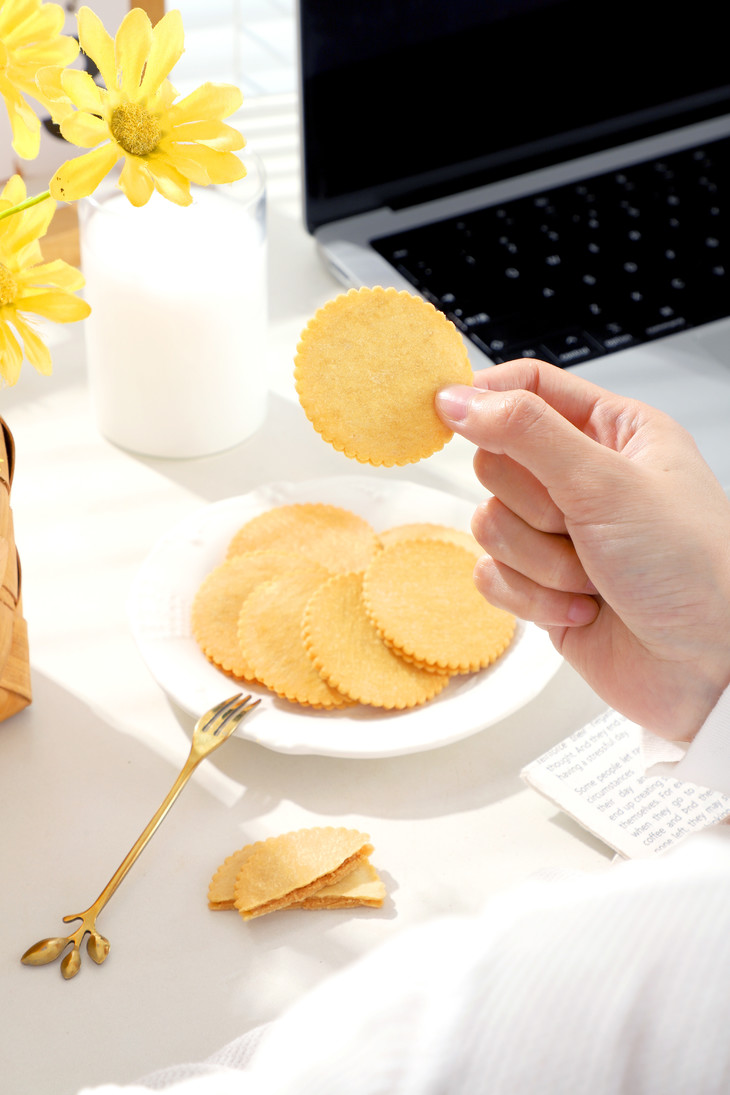 双重酥脆,匠心工艺 外层马铃薯薄饼含≥6.5%马铃薯雪花全粉,叠加安佳黄油(≥5%)烘焙,酥脆加倍,奶香浓郁。 独特膨松工艺,打造空气感薄脆质地,单片饼干薄度≤1.5mm。