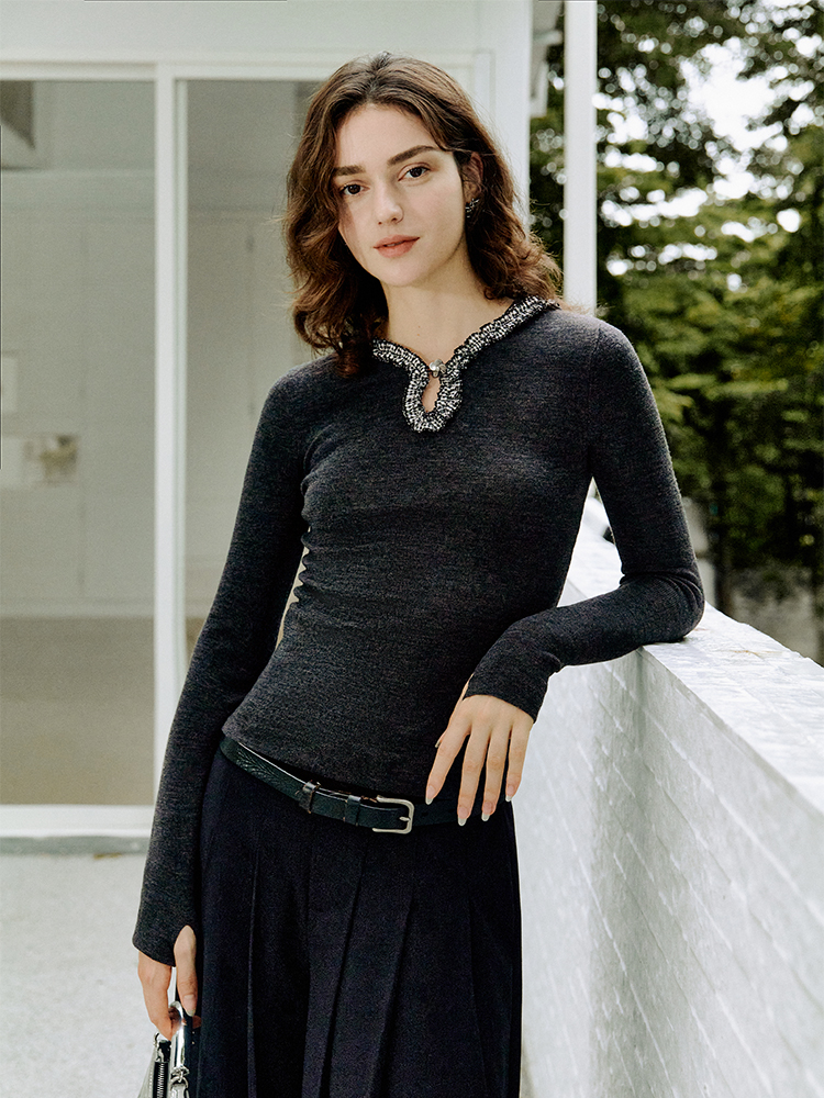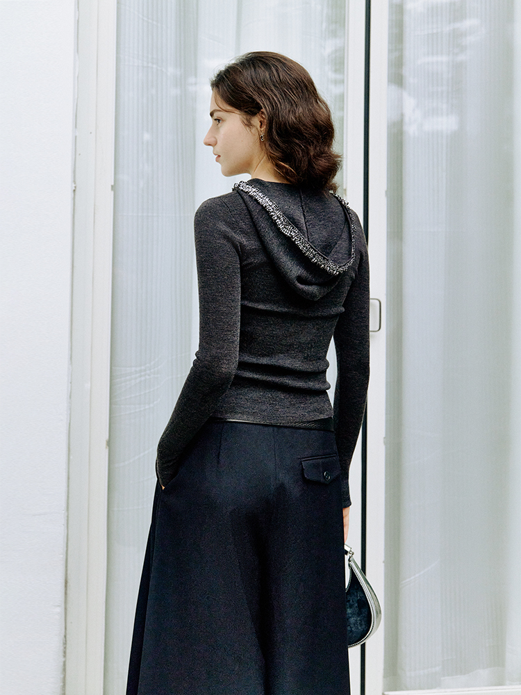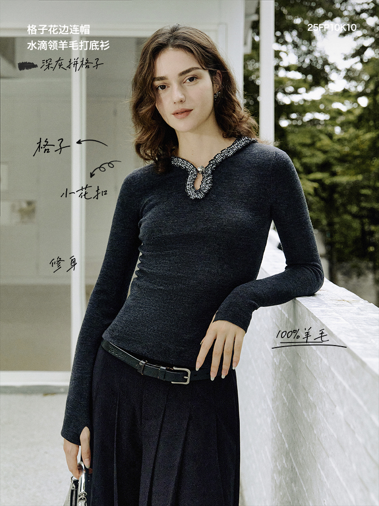 ForPoem 现货 25/FW原创设计灰色格子花边连帽水滴领针织羊毛打底衫