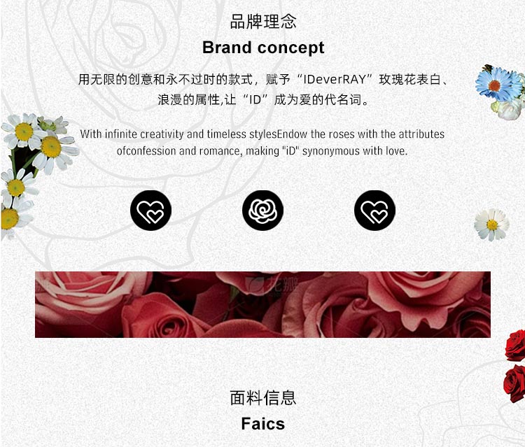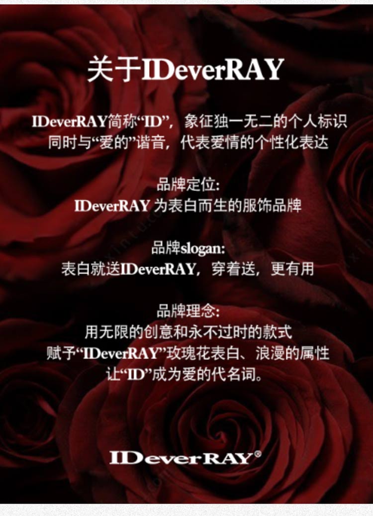 - ❣IDeverRAY简称“ID”,象征独一无二的个人标识,同时与"爱的"谐音,代表爱情的个性化表达 品牌slogan:玫瑰🌹配ID,更好的告白 品牌语言:I ID YOU