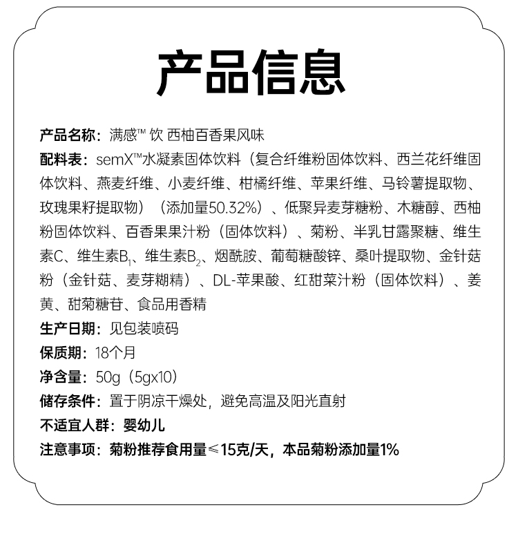 【薄荷健康】满感饮 餐前饱腹膳食纤维饮品 50g(5g*10)/盒