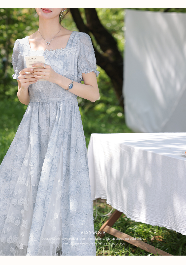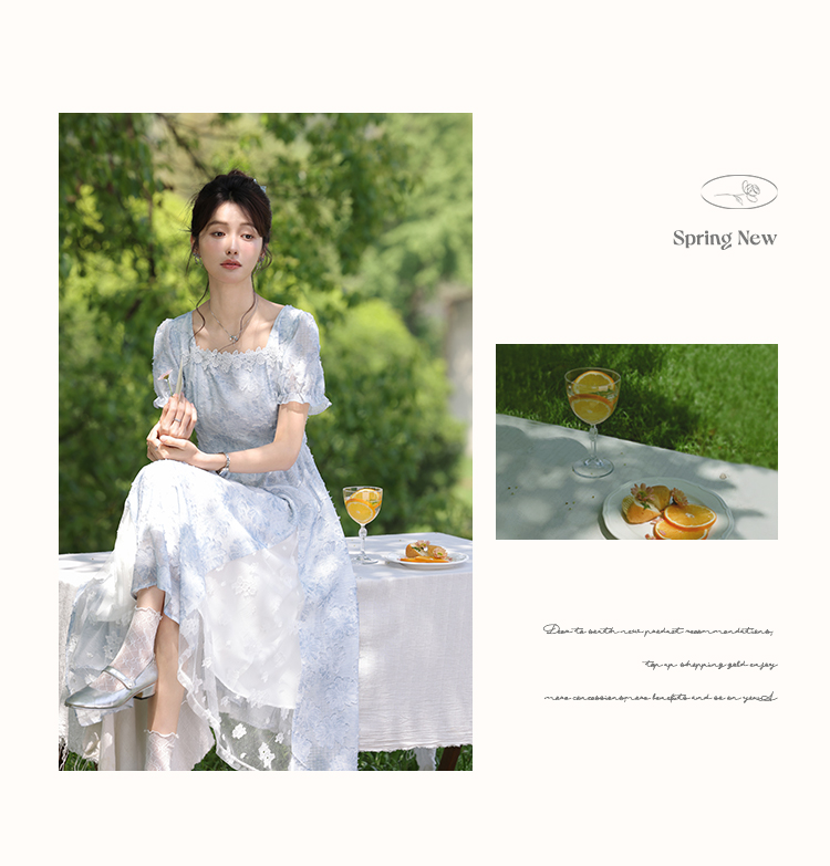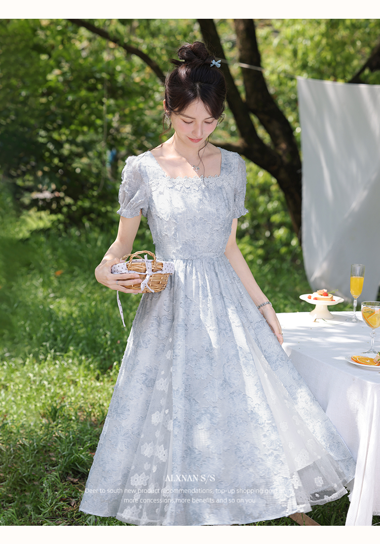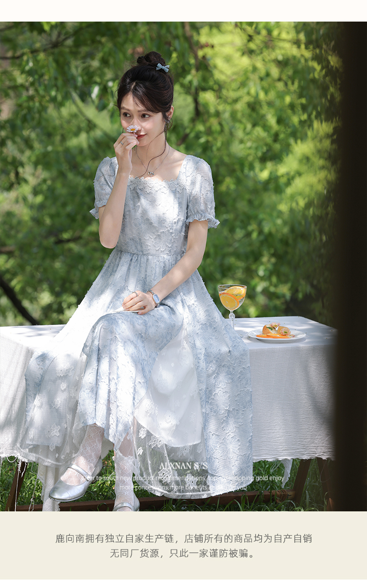 鹿向南「风传花信」浅蓝色碎花连衣裙女夏新款法式收腰设计感长裙DYL661834