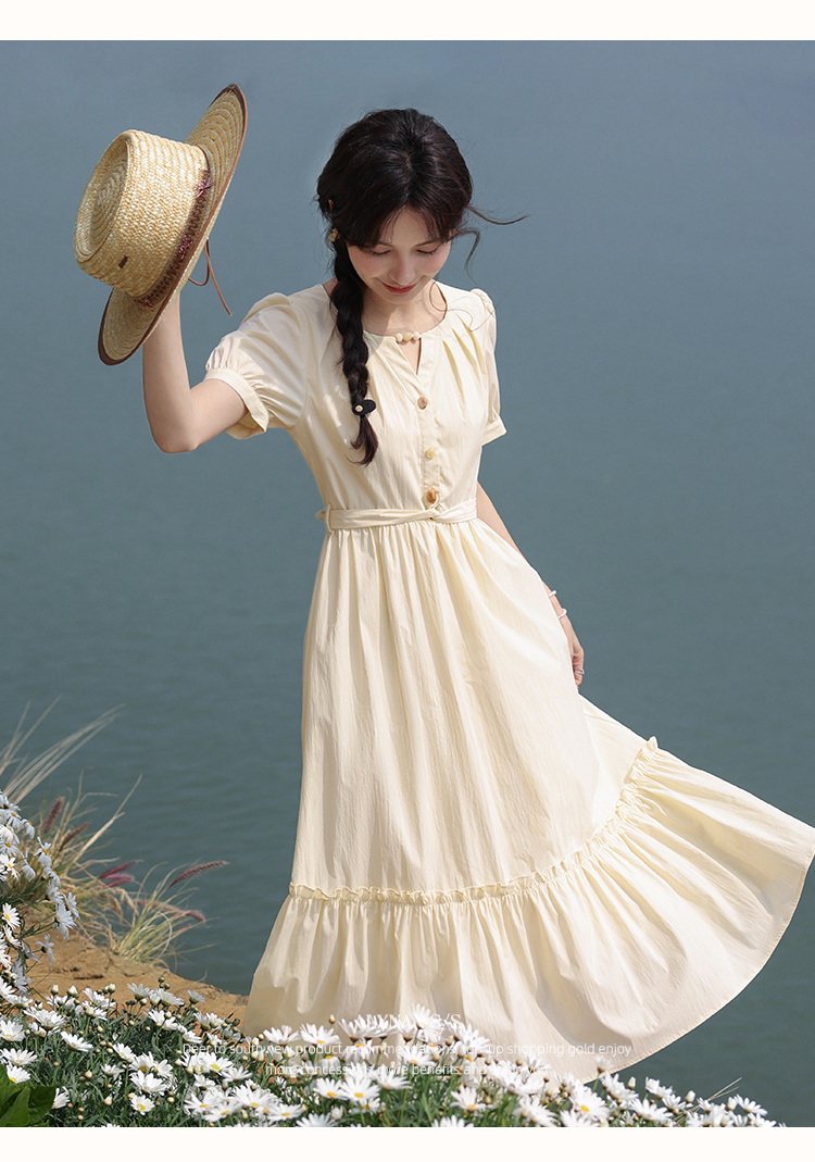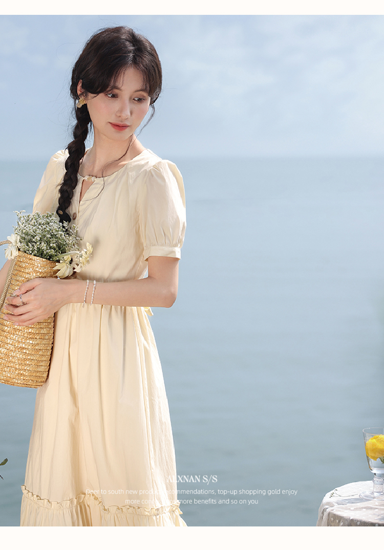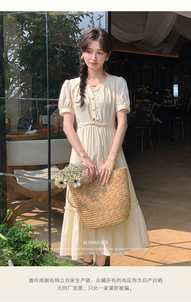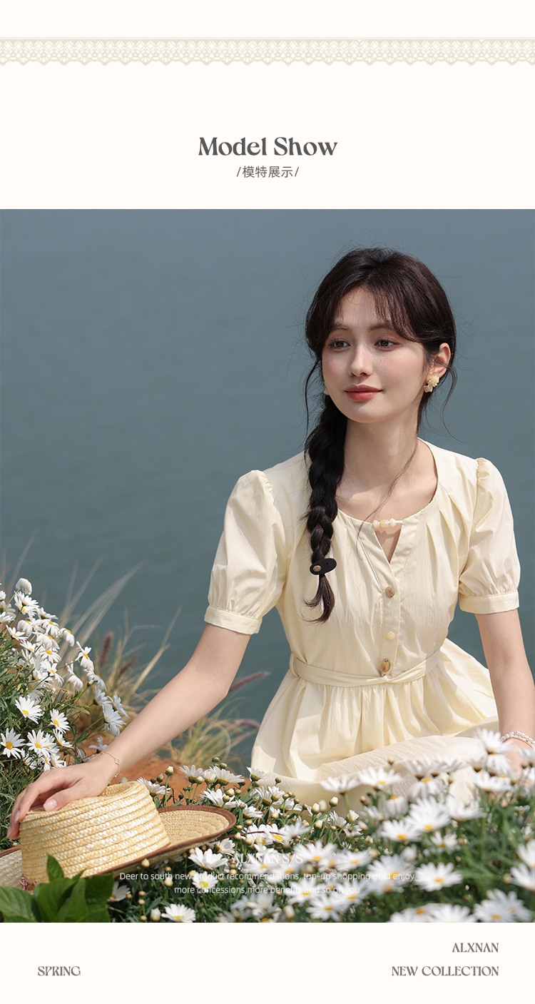 【65折秒杀】鹿向南「花园秘境」淡黄色气质A字短袖连衣裙女夏季浪漫优雅长裙L55115