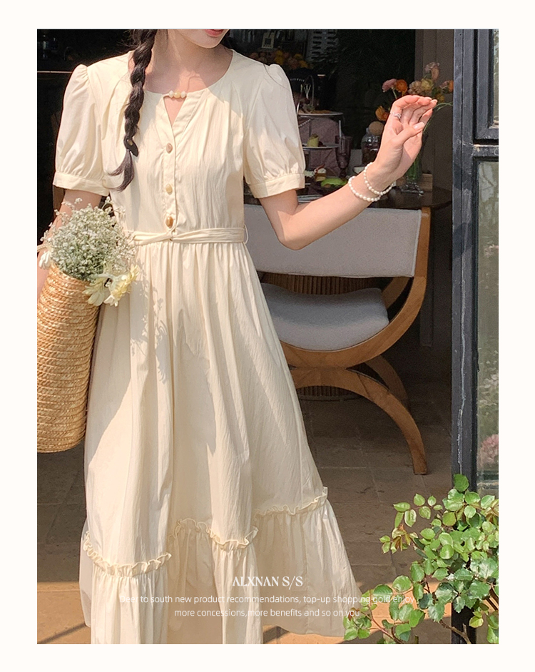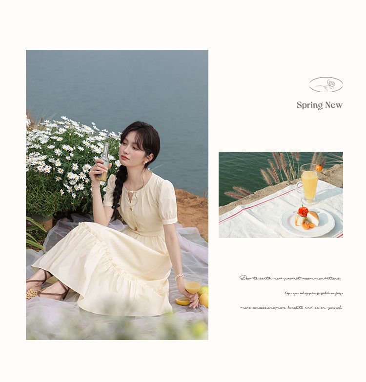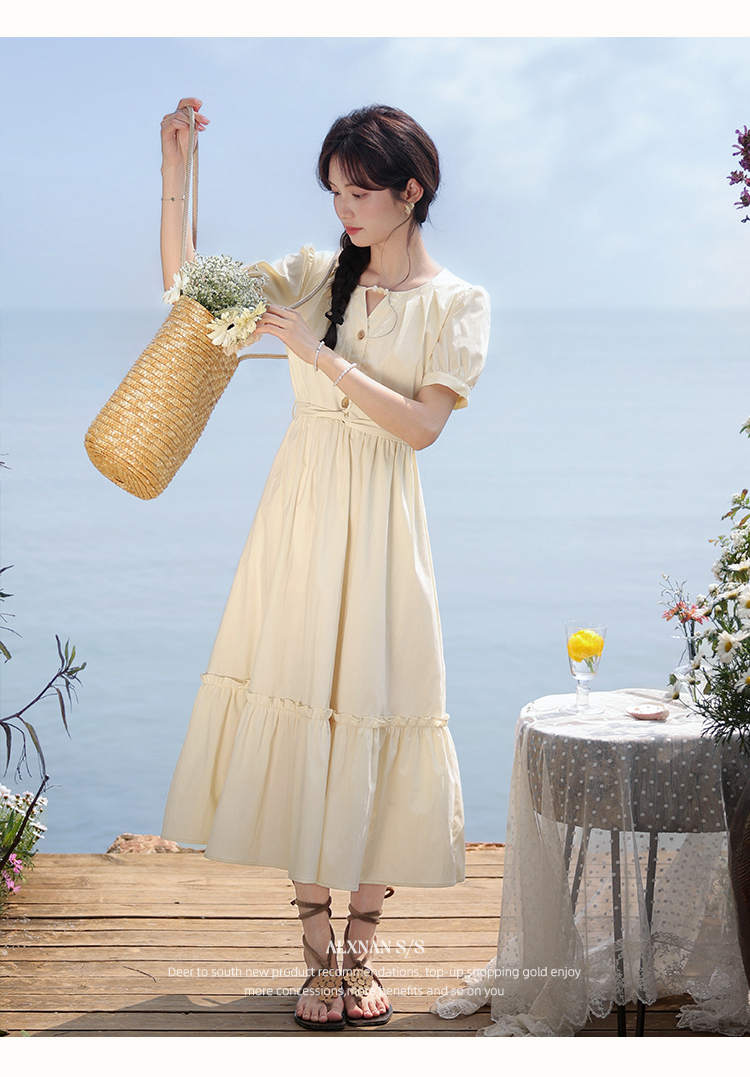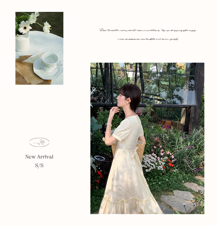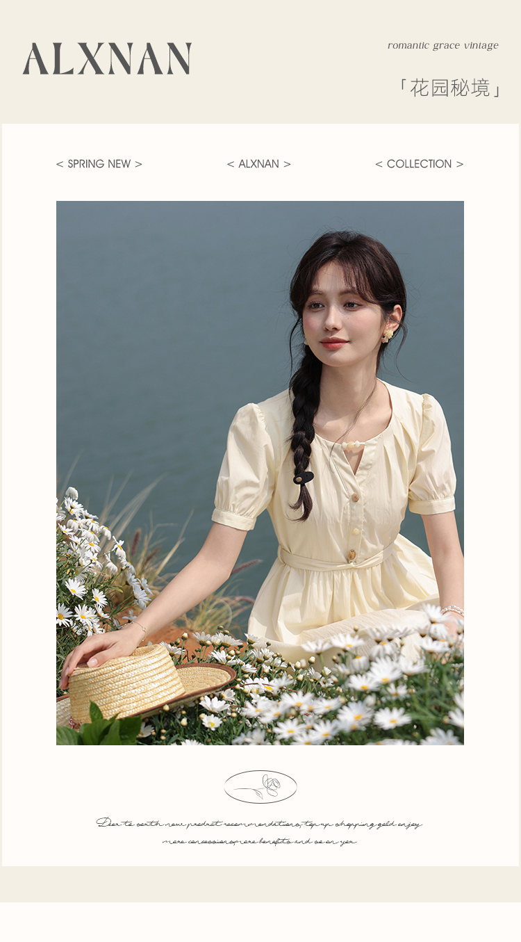 【65折秒杀】鹿向南「花园秘境」淡黄色气质A字短袖连衣裙女夏季浪漫优雅长裙L55115