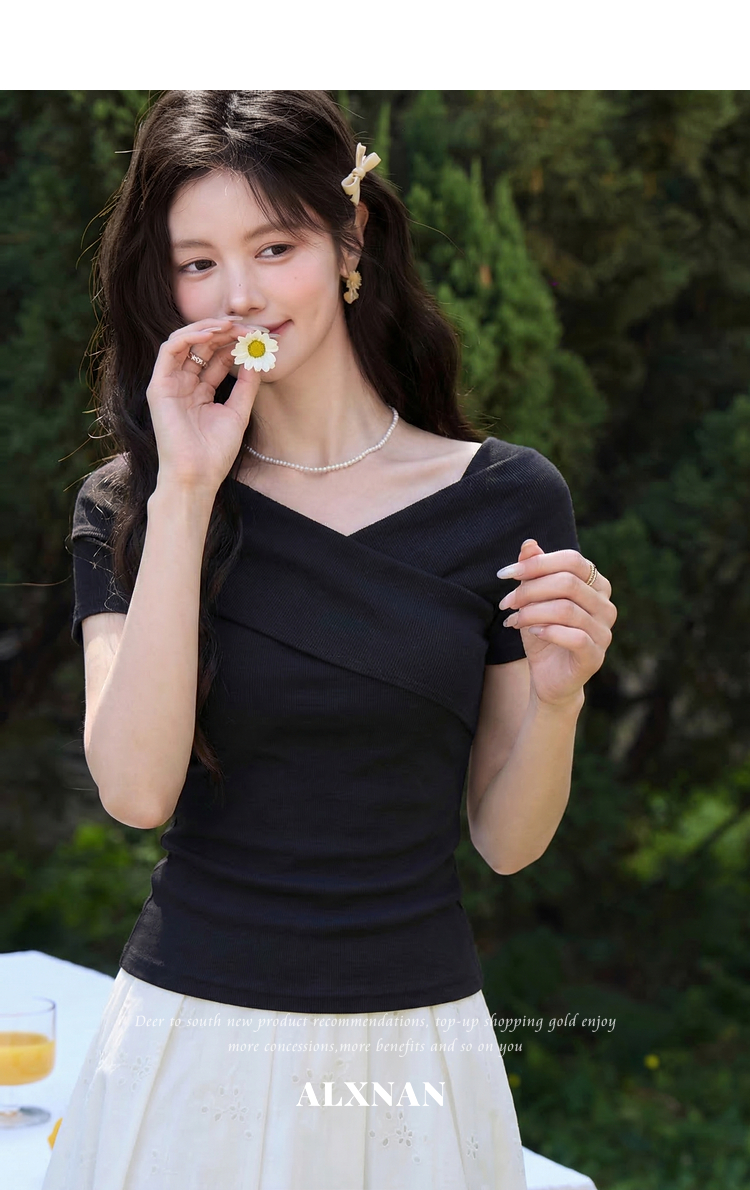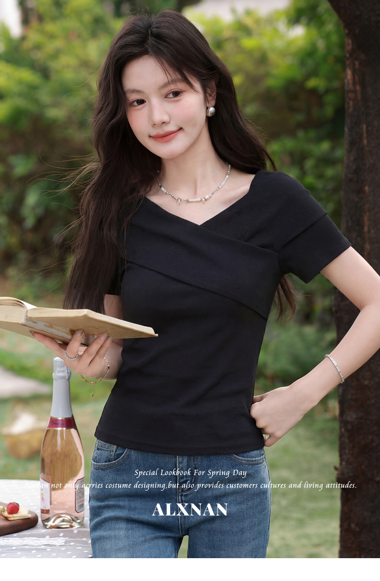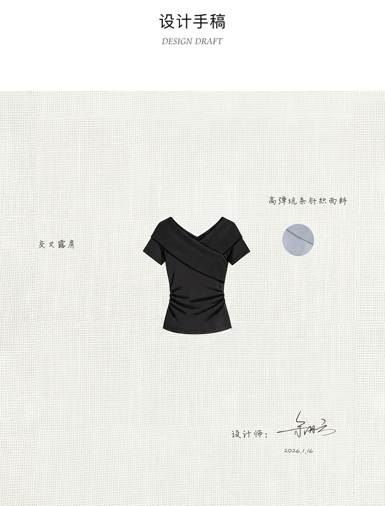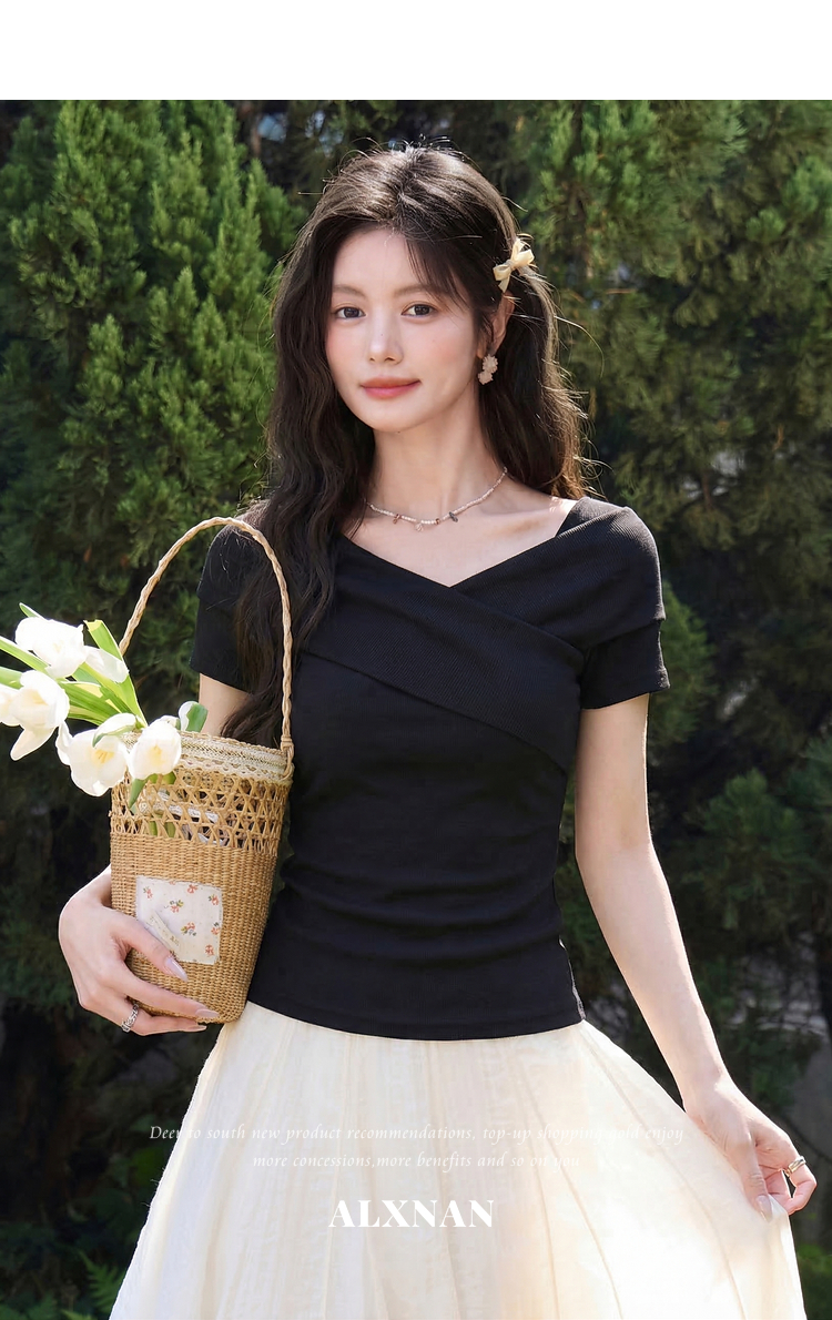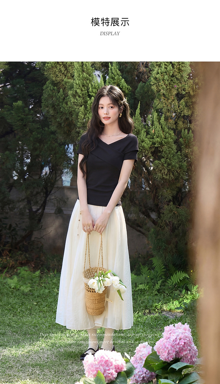 鹿向南「塞纳来信」莱赛尔高级感黑色设计感短袖T恤女夏气质上衣