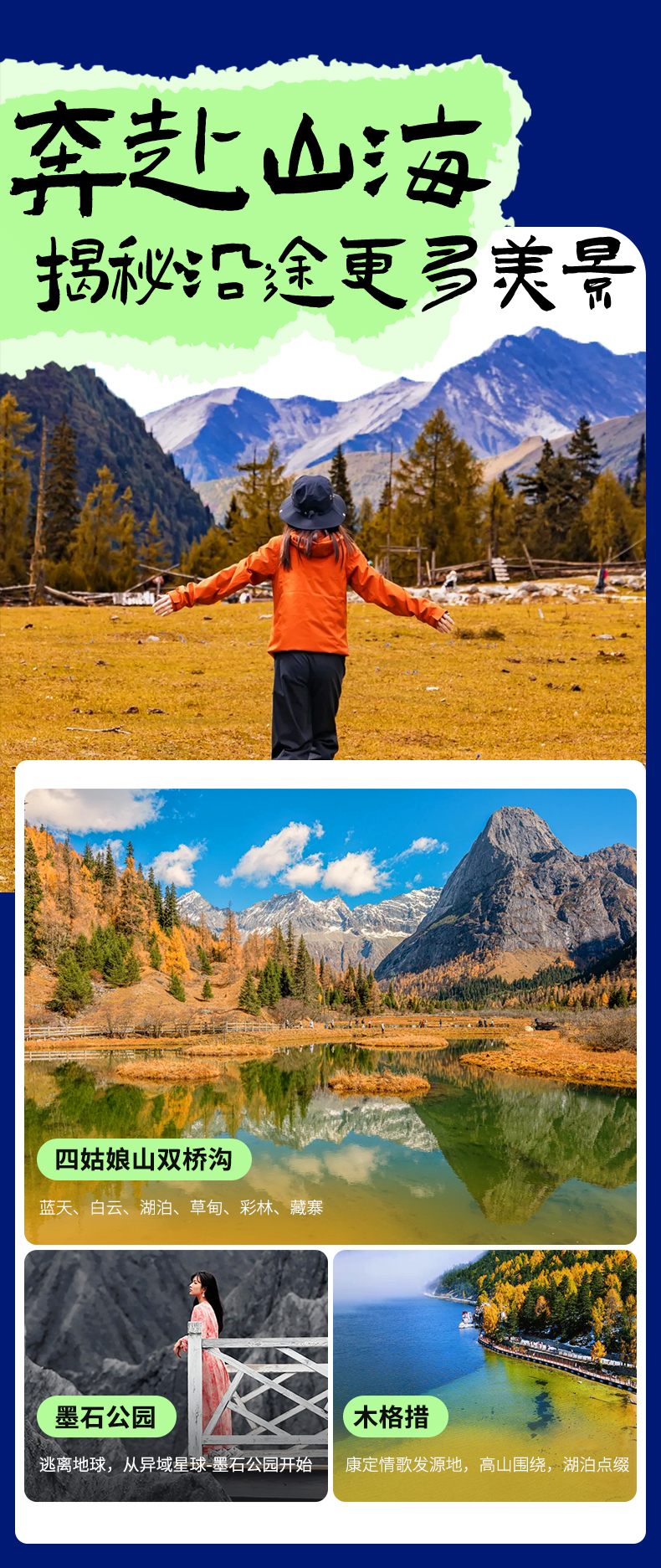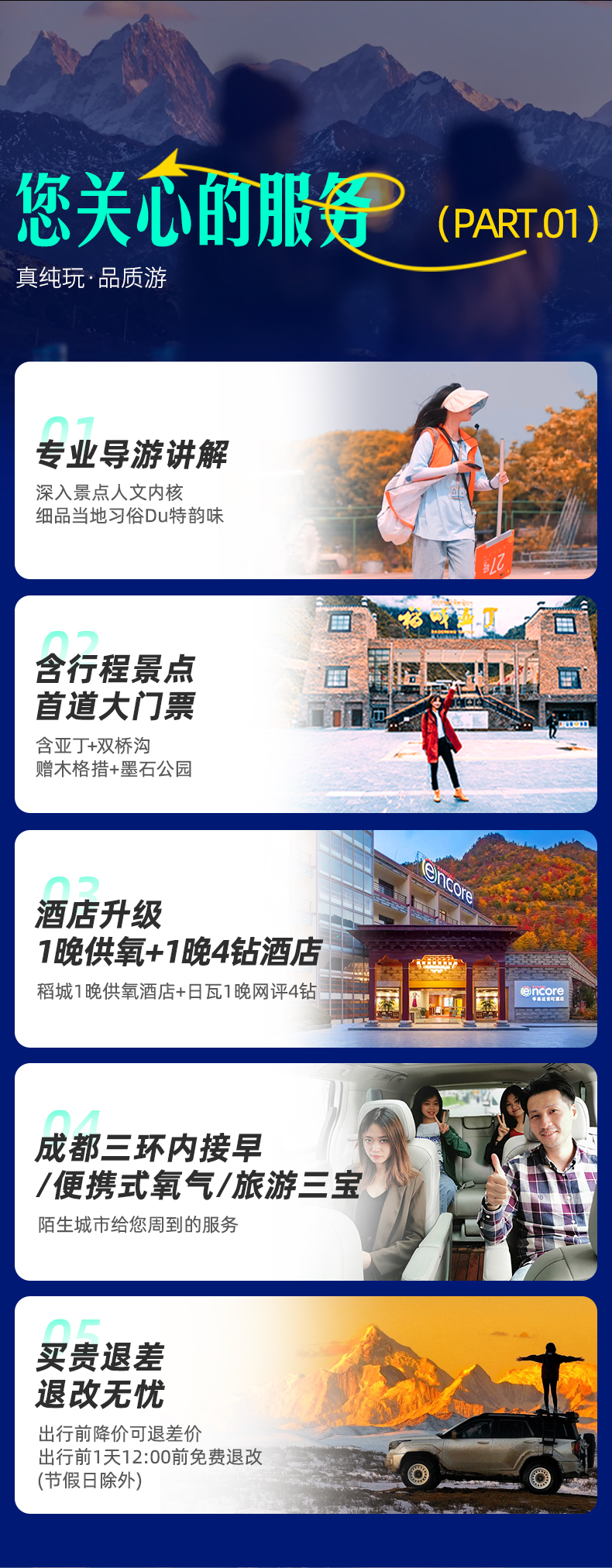 门票退免:稻城亚丁(优惠退30,免票退60)、四姑娘山双桥沟(优惠退20,免票退40)、木格措+墨石(无退费)