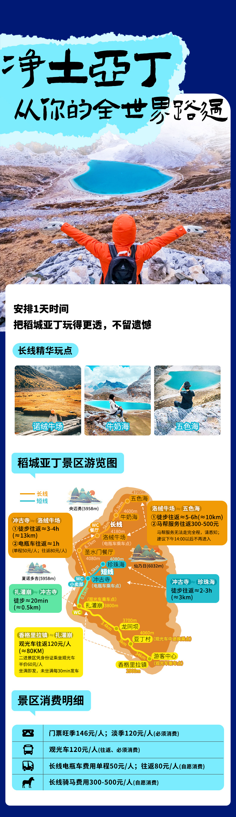 注:亚丁景区贡嘎措至牛奶海、五色海区域,因冬季道路结冰等安全原因,2025年11月24日—2026年4月15日期间实施封闭管理;长线封闭期间,请游玩短线,且景区门票价格调整为120元/人。