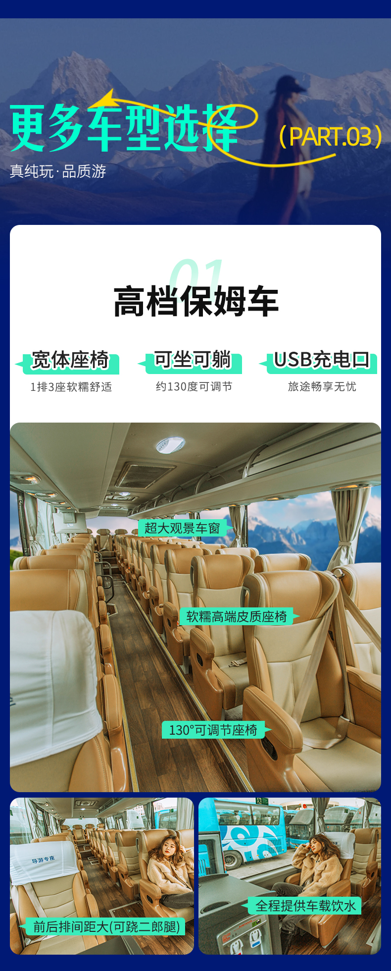 注:车型不支持指定,根据人数调派车型,保证一人一正座(行车座位须每天轮流换座,不指定安排座位,如您有特殊需求,可在团上自行协调,敬请谅解)。