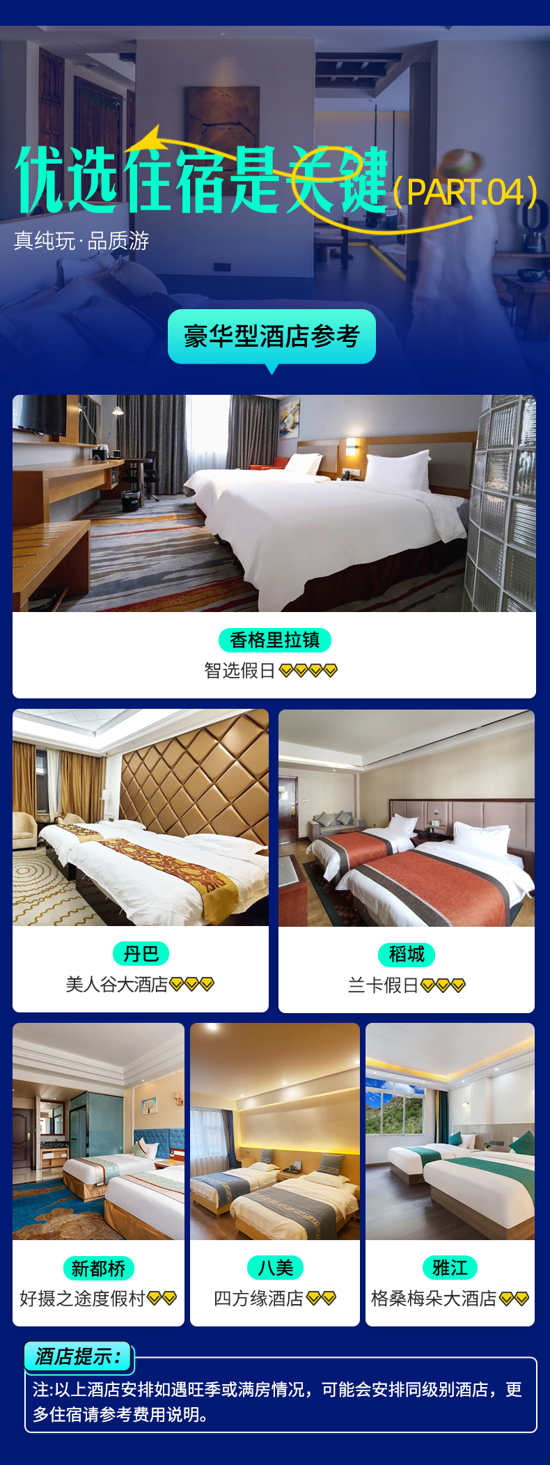 雅江/新都桥:(新都桥(聚园/美域A栋/好摄之途/凯逸/四季如歌/浙海/锦程/途乐林卡/御尊/泰风和畅/大观景/爱摄影/高尔山精品民宿/祥敏/浙景/良汐别院/德瀚酒店/嘉姆尊品质型/星辰主题/康藏华庭酒店/锦程大酒店或同级)、雅江(朵拉星辰民宿/格桑梅朵大酒店/桉达/川藏大酒店/木雅大酒店/走婚大峡谷酒店/君忆瑞庭酒店/美景大酒店/承诺驿站/新希悦或同级))