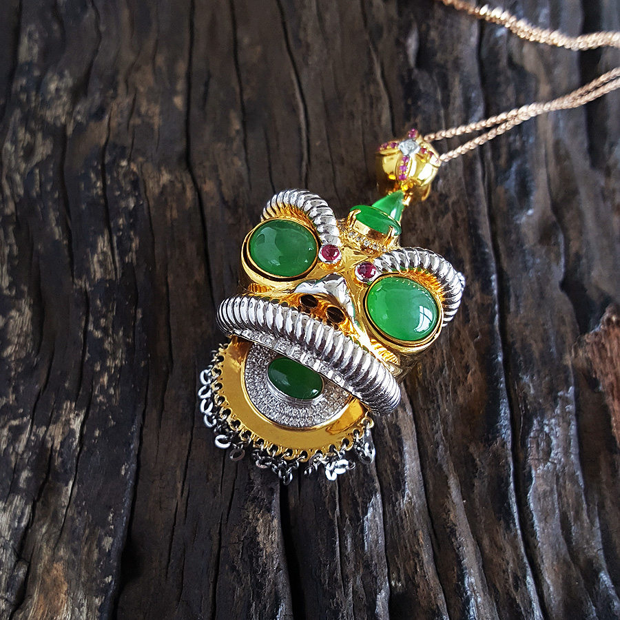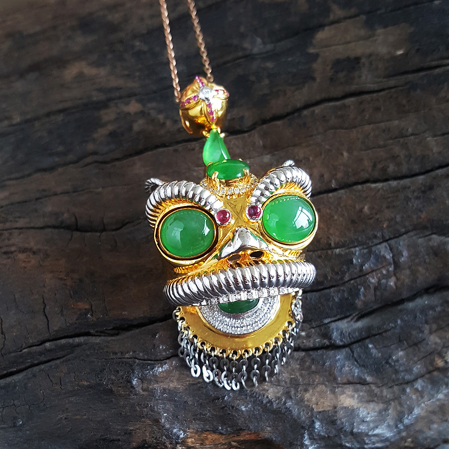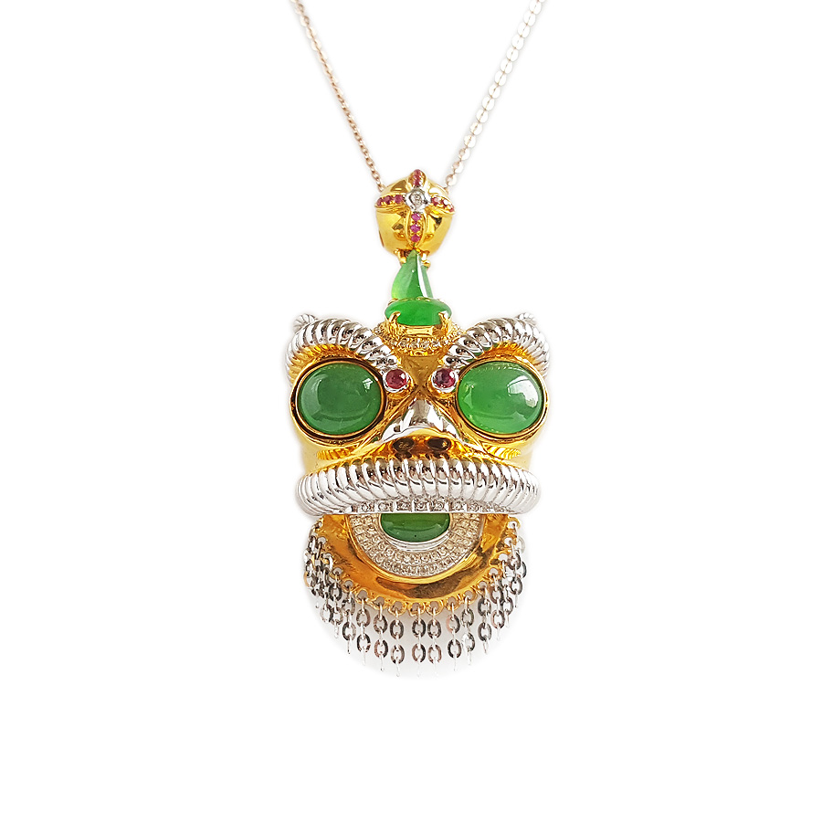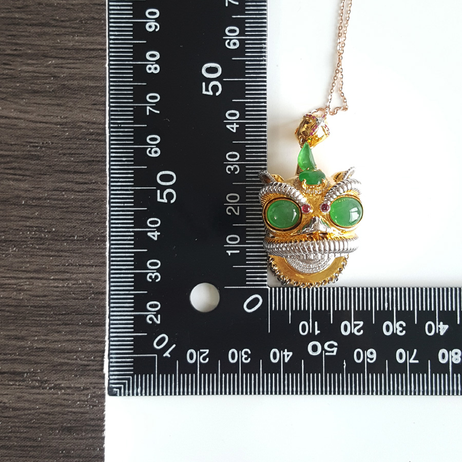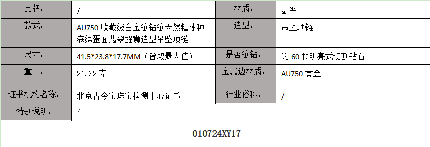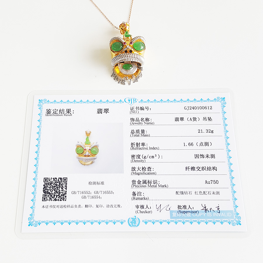 【天然正品】AU750收藏级白金镶钻镶天然糯冰种满绿蛋面翡翠醒狮造型吊坠项链010724XY17