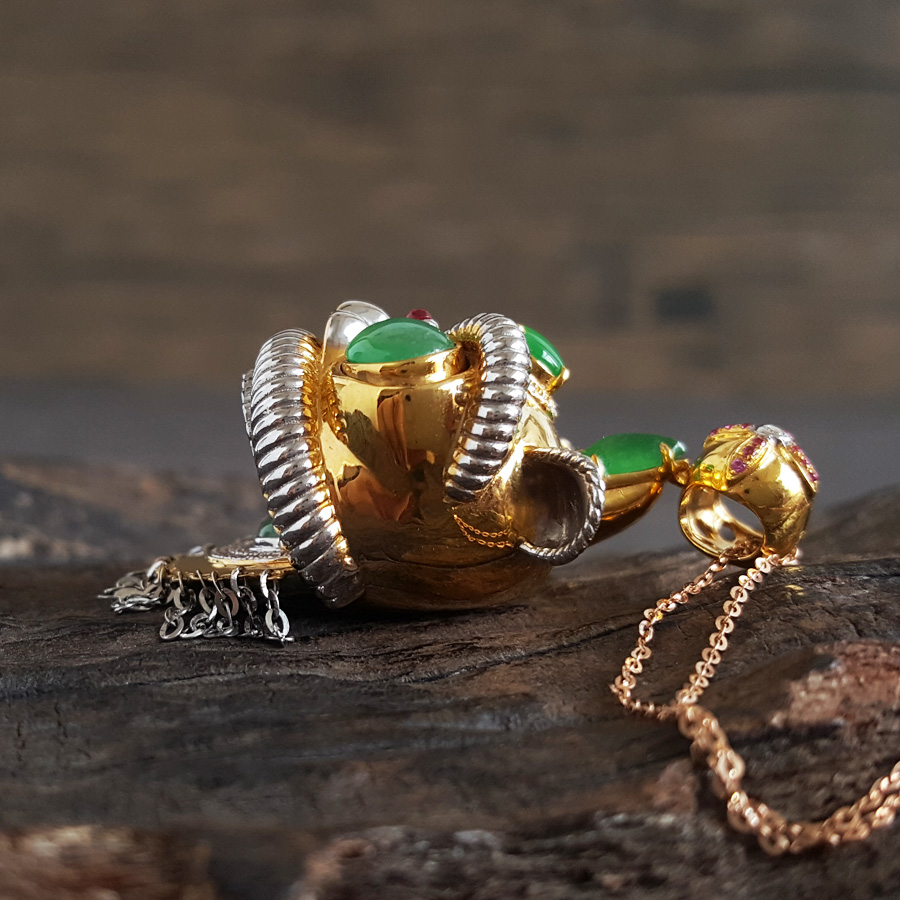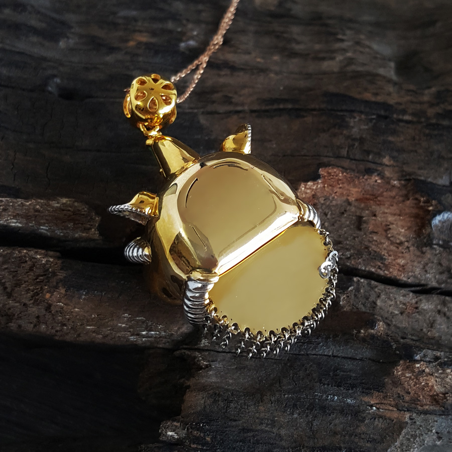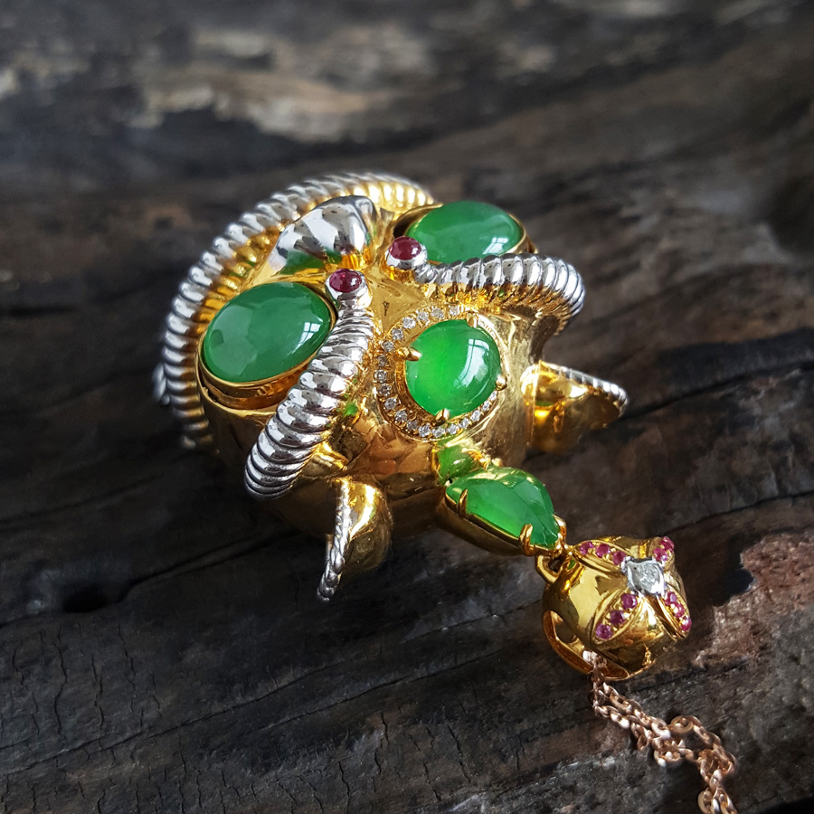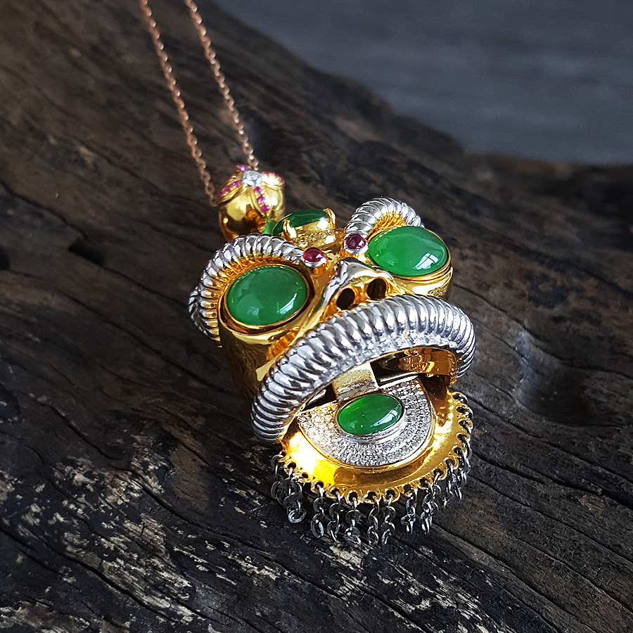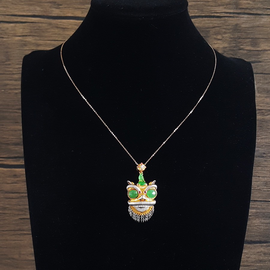 【天然正品】AU750收藏级白金镶钻镶天然糯冰种满绿蛋面翡翠醒狮造型吊坠项链010724XY17