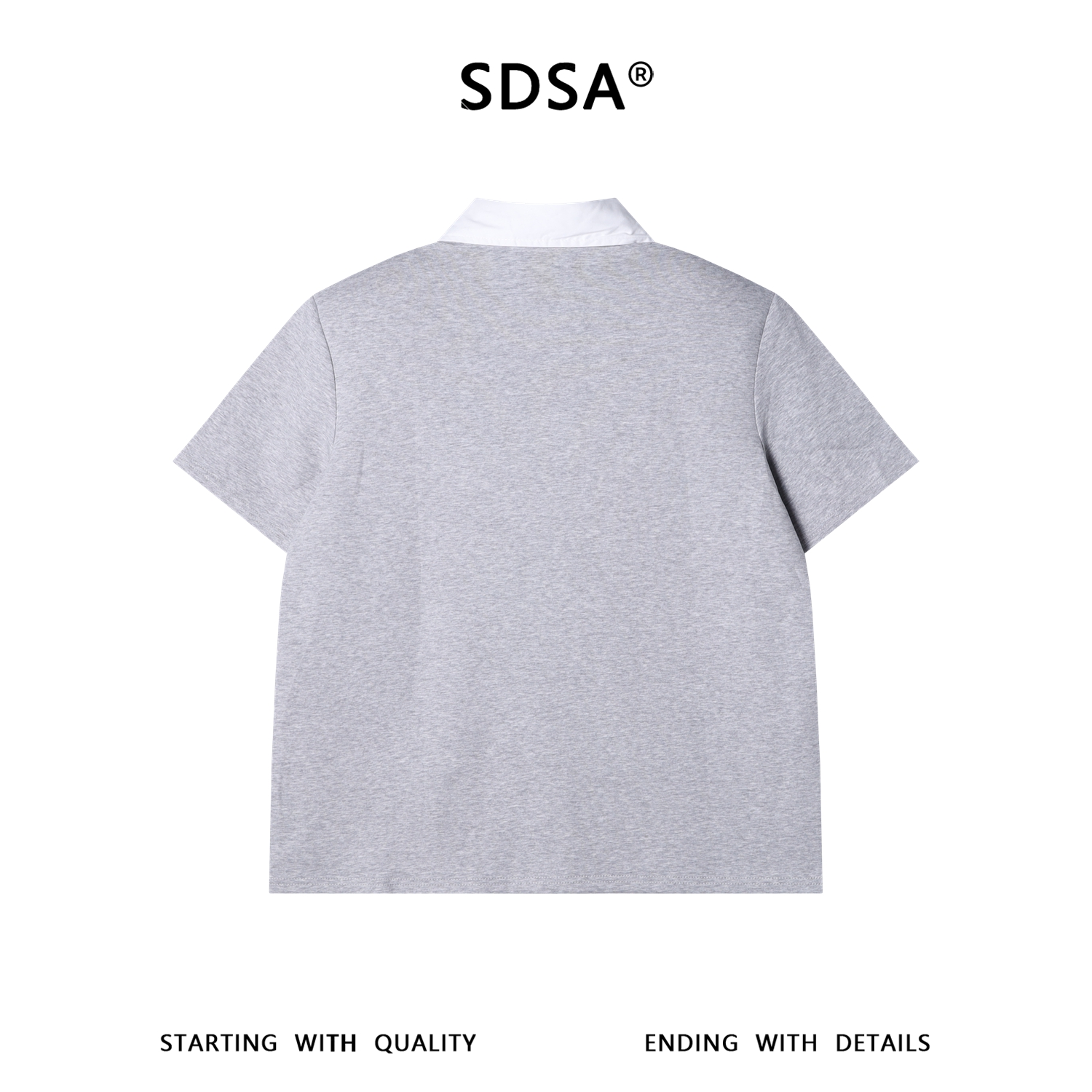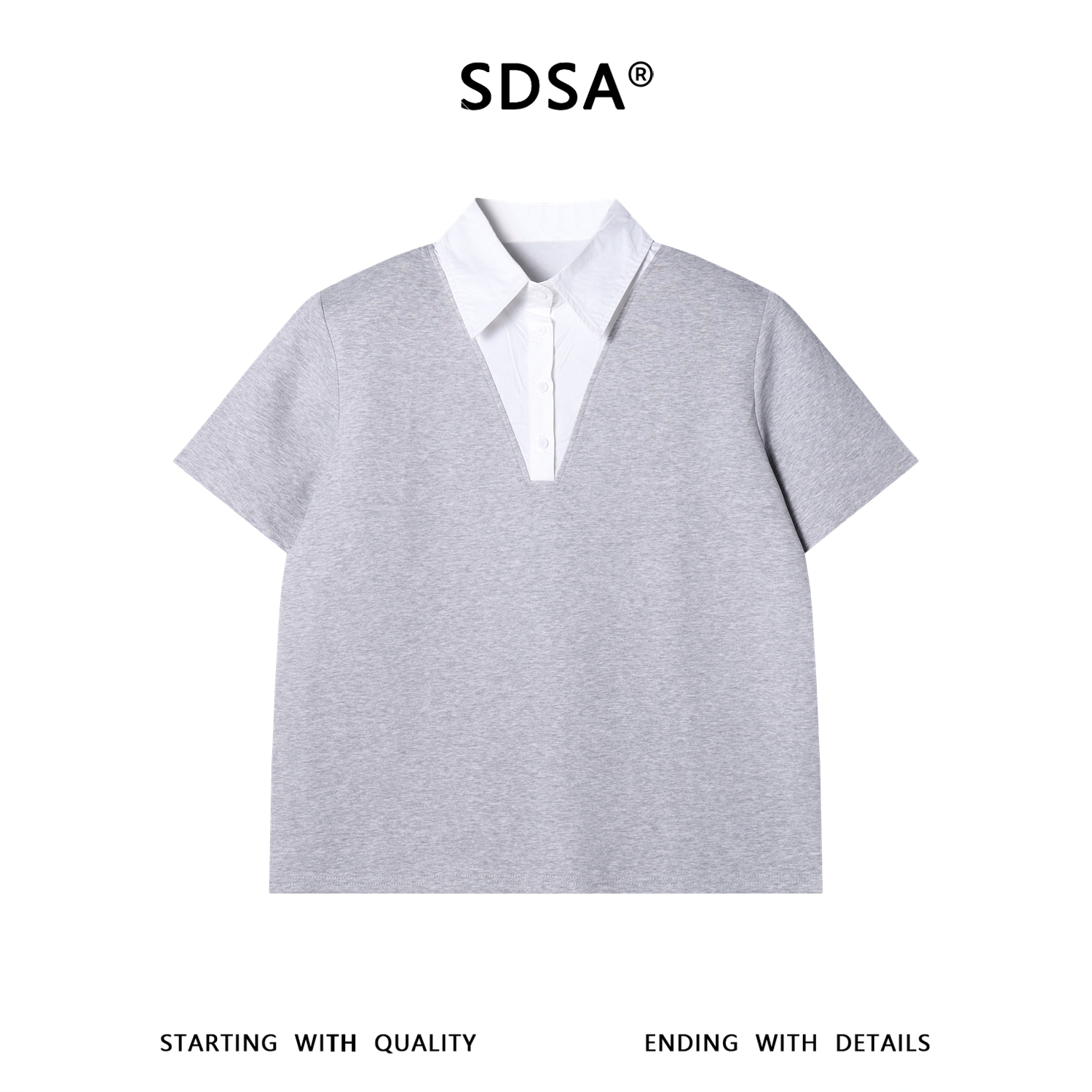 SDSA男装2026新款轻奢撞色假两件翻领V领短袖T恤宽松通勤休闲上衣