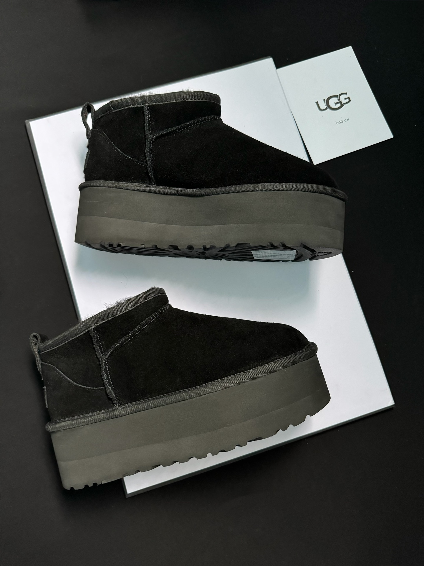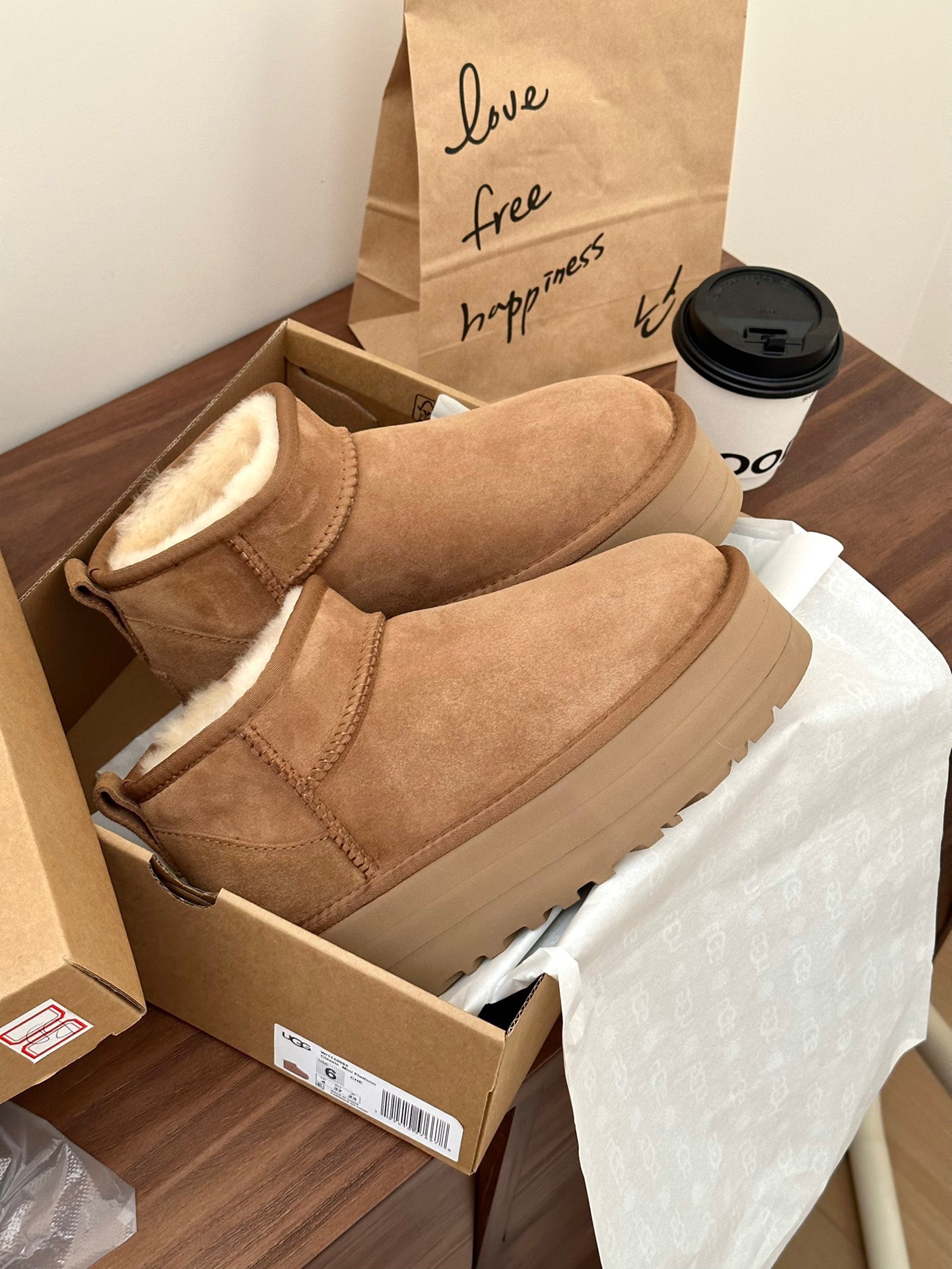 UGG 厚底mini经典款。2024 专柜现款 UGG顶级代购级版本。鞋面 :牛反绒 ,内里皮毛一体 ,双层 鞋面,保暖对版官网,区别于市场上不对版单层皮毛一体。大底:evr太阳花大底 按压反弹 耐磨抗压 拒绝市场上劣质越穿越薄型大底 ,大底厚度5.5cm 左右 区别市场厚底不够类型。 代工工厂原班师傅。做工精良。三次品检 保证每一双合格完美。颜色:栗色 黑色 沙色。码数35-40