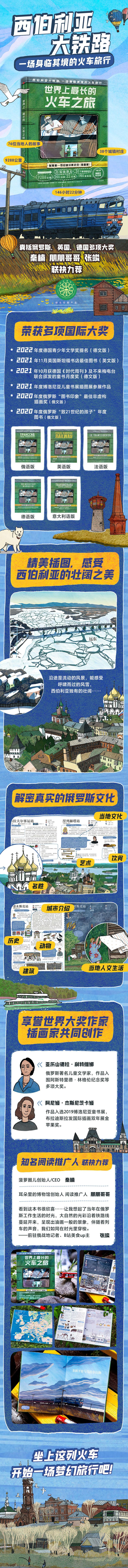 小读者可以跟着书中的旅行者们,历时6天,看火车穿越伏尔加河,穿过乌拉尔山,经过贝加尔湖,冲过大平原……除了世界闻名的地方,本书更向读者展示了一些小车站所在地人们的生活。