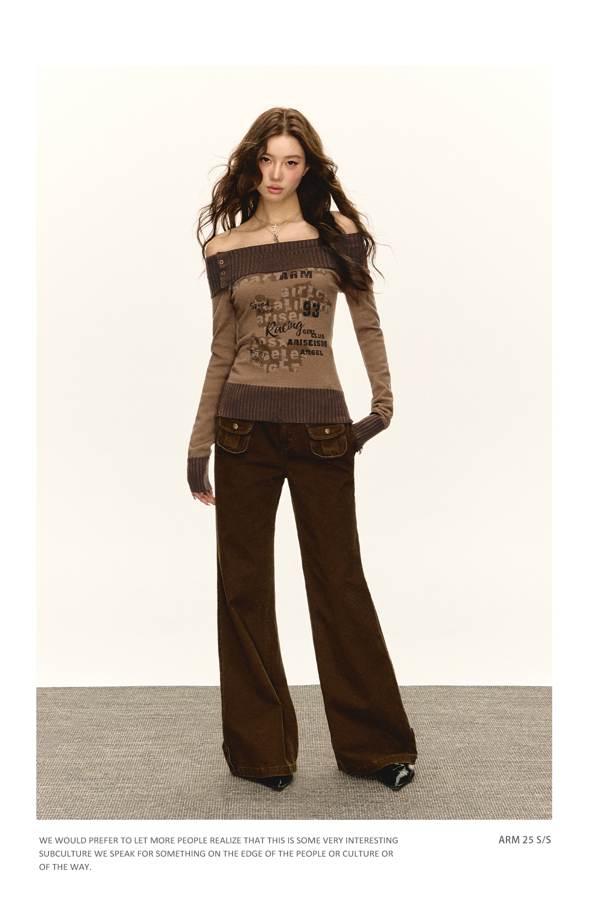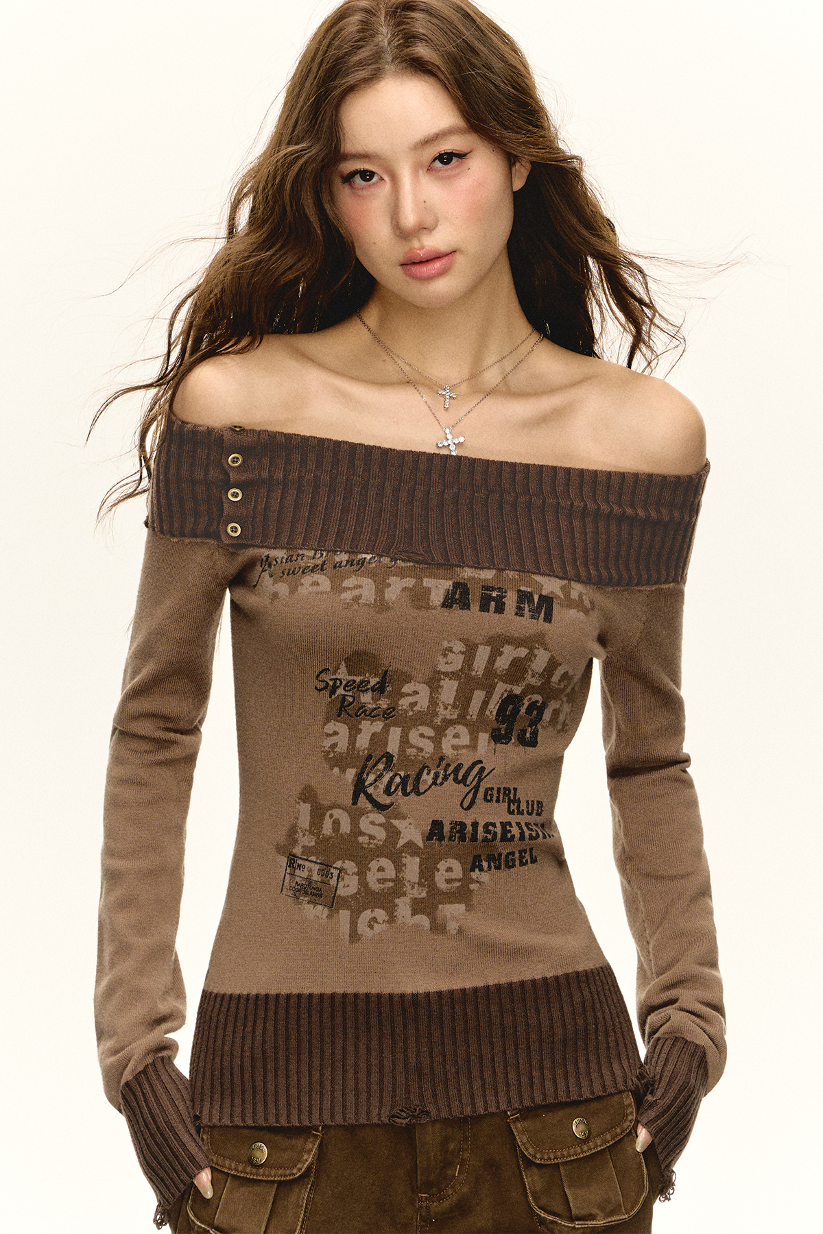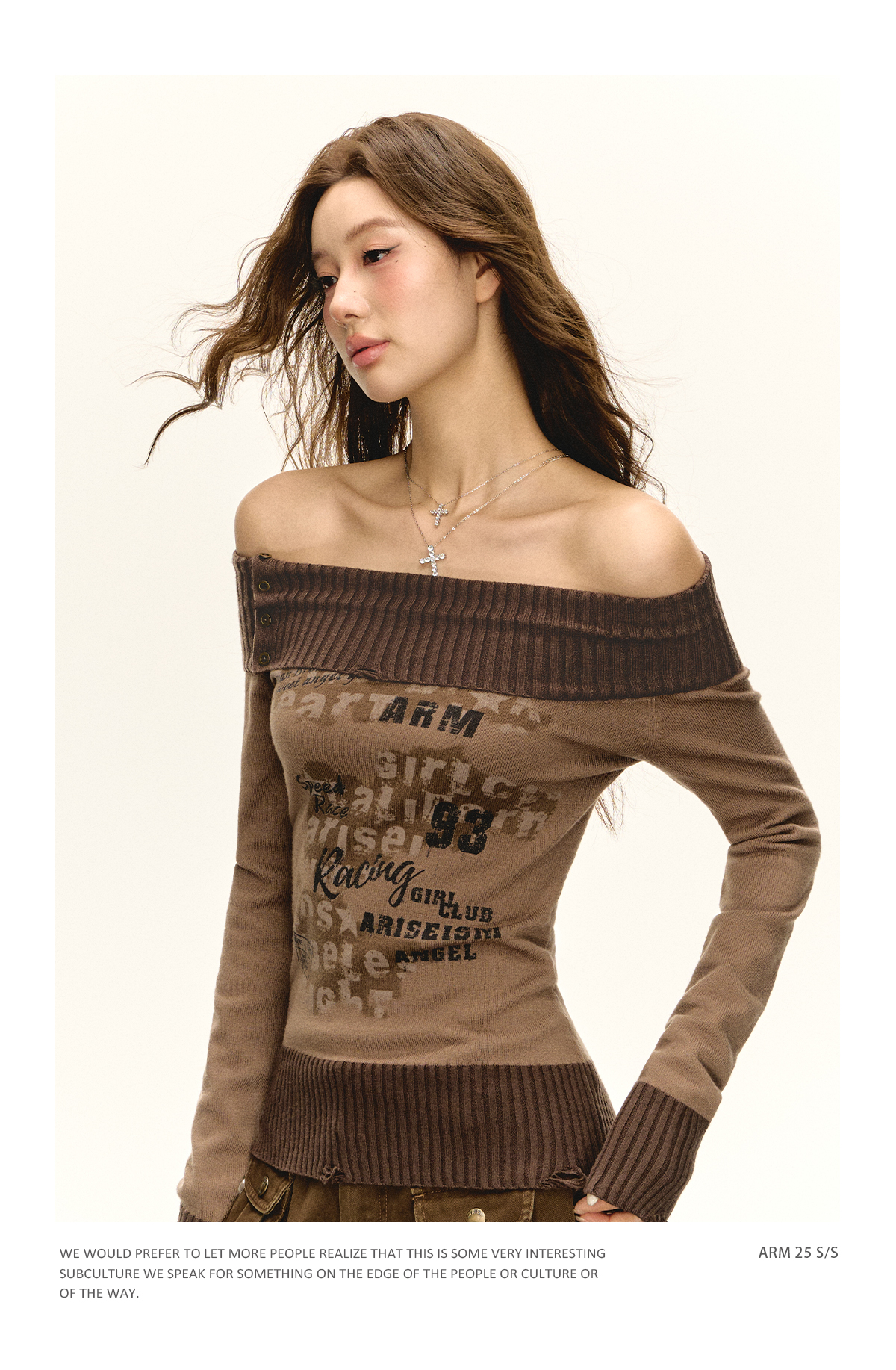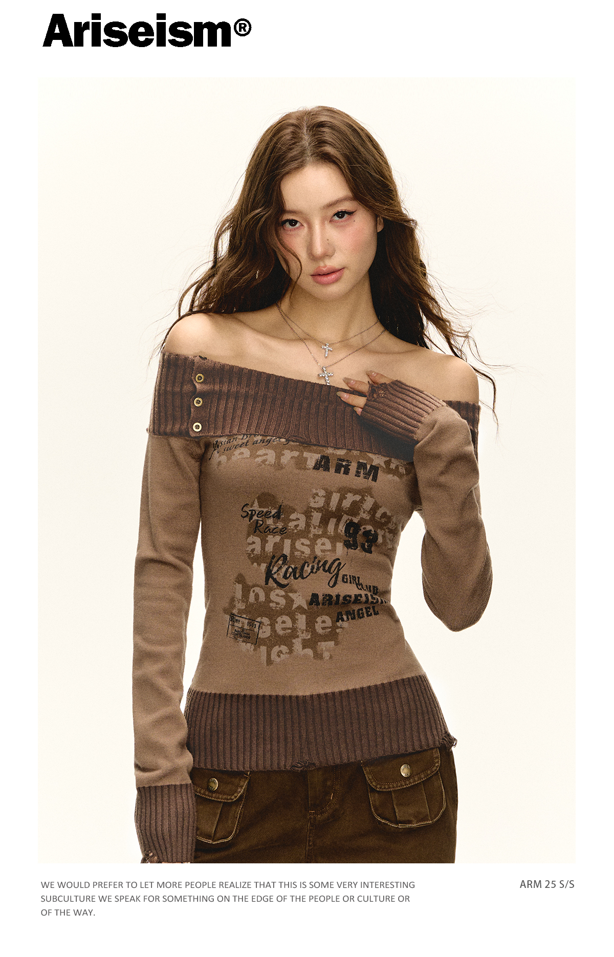 Ariseism 美式复古设计感一字肩毛衣女秋季新款显瘦上衣