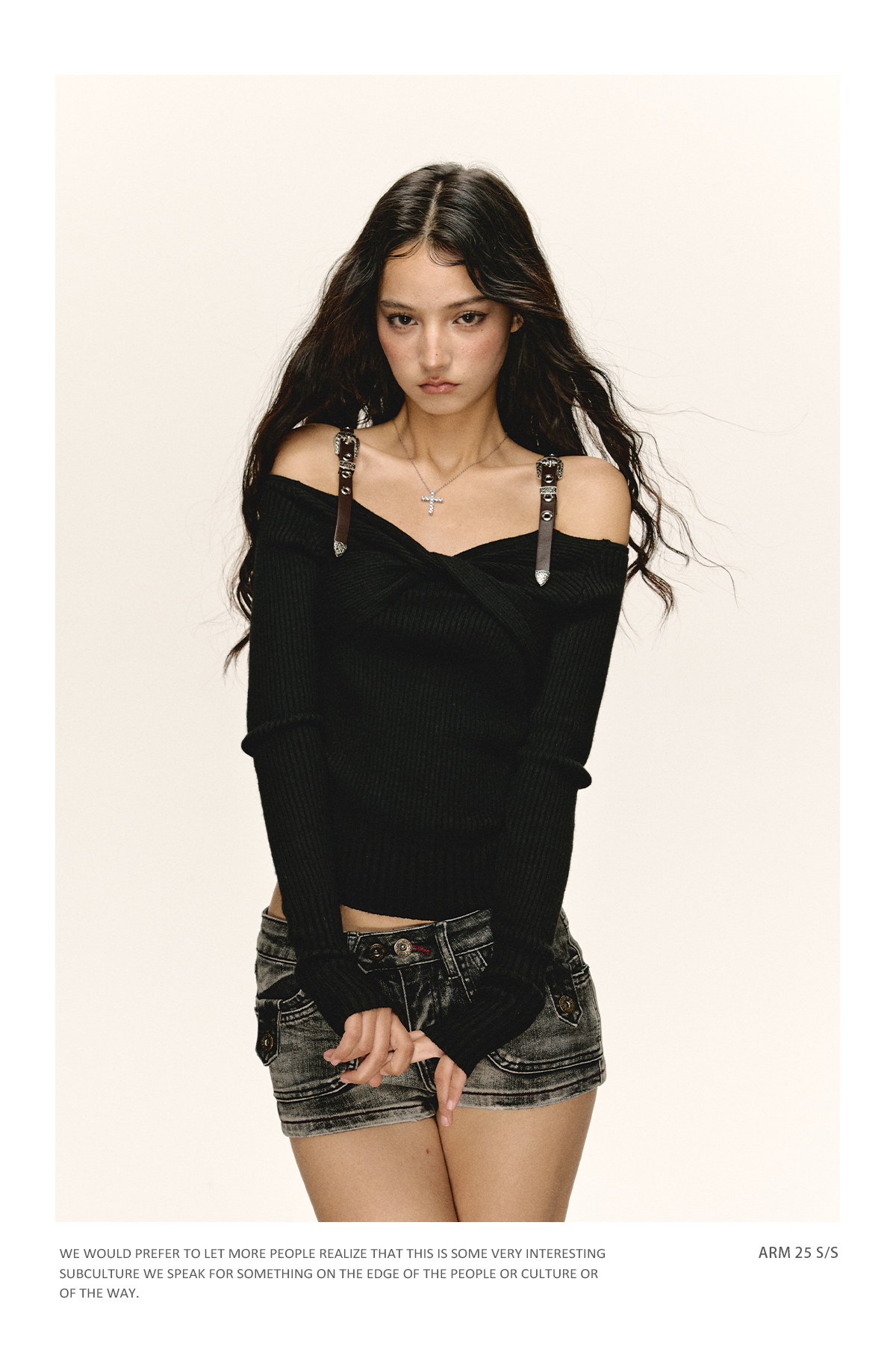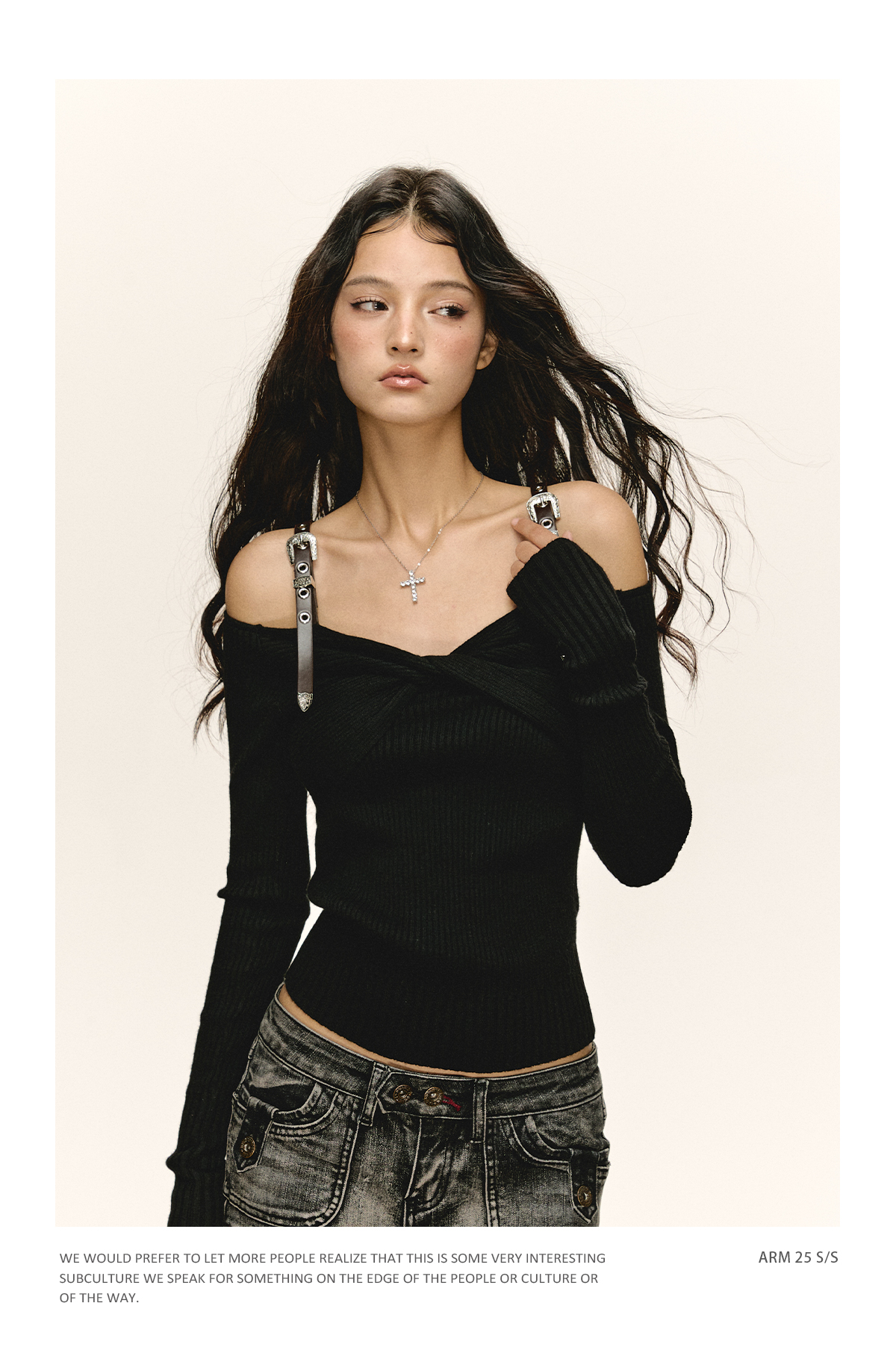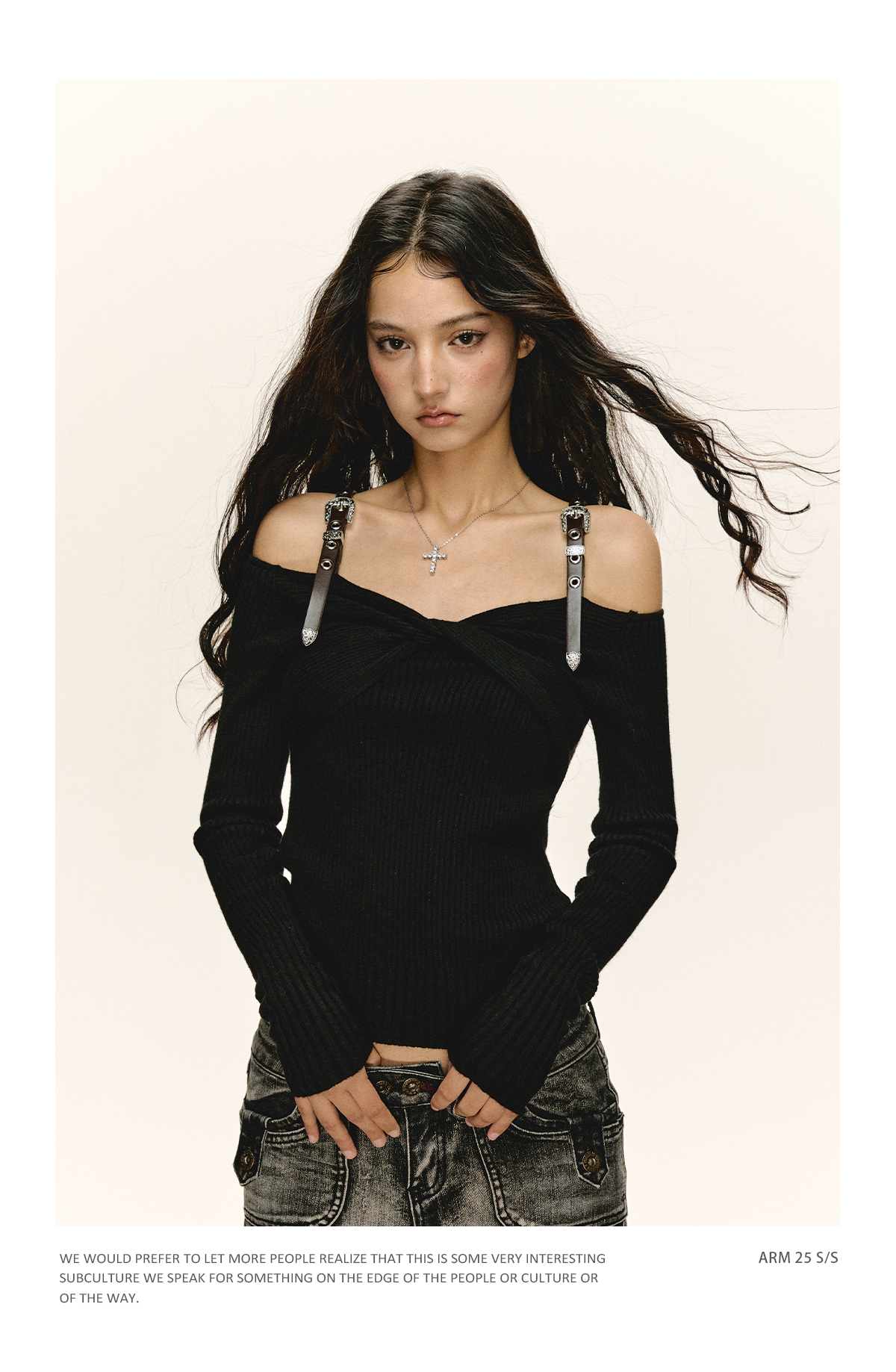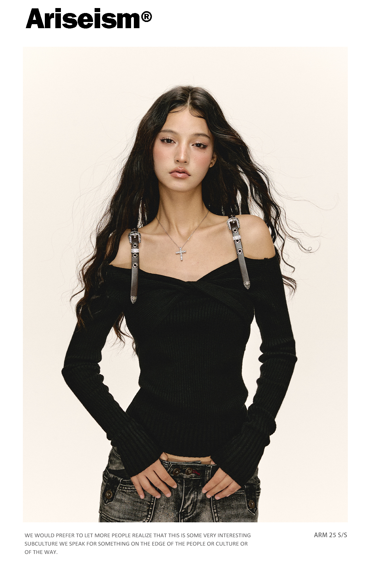 Ariseism 美式复古设计感皮扣露肩长袖针织衫女秋季新款修身上衣