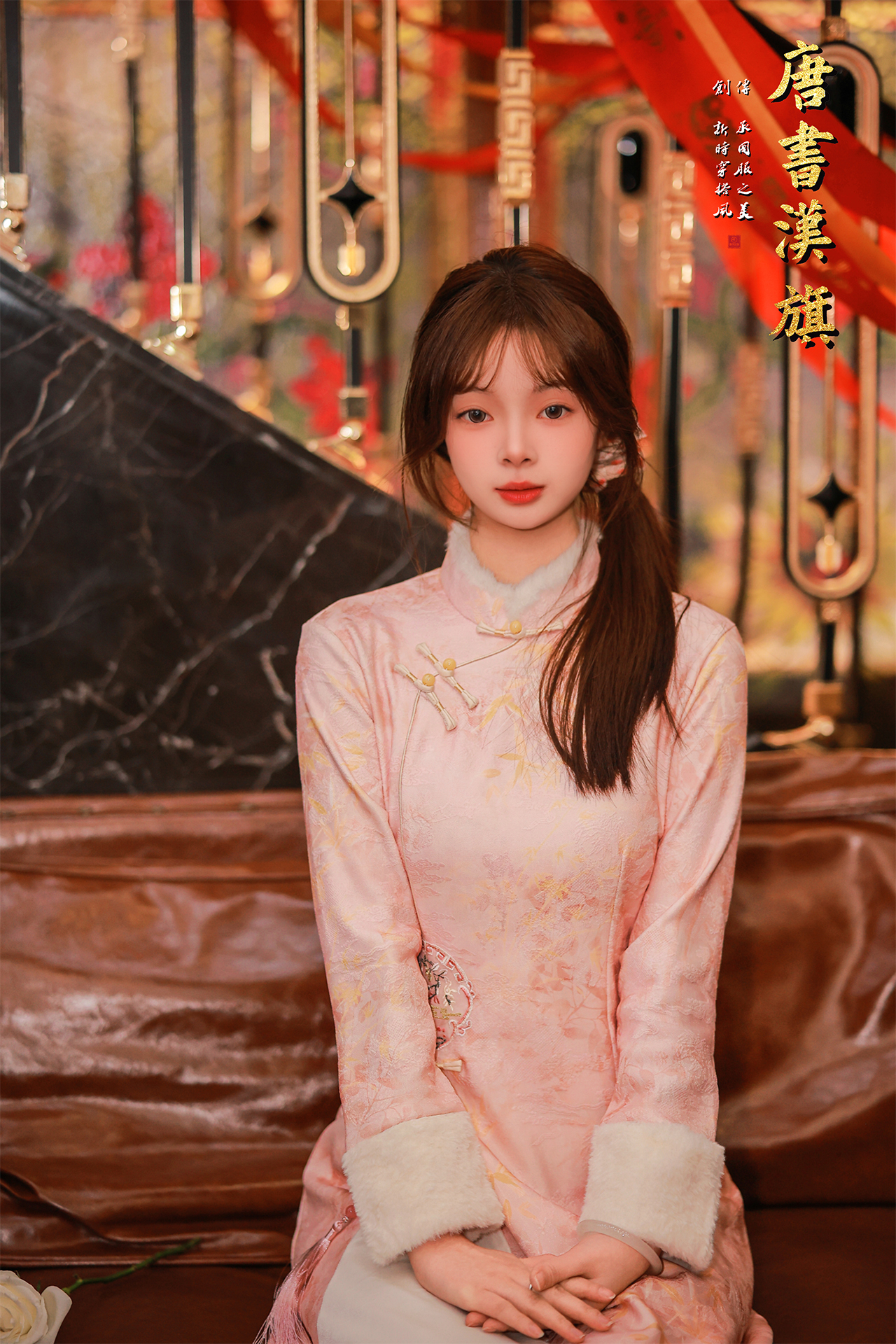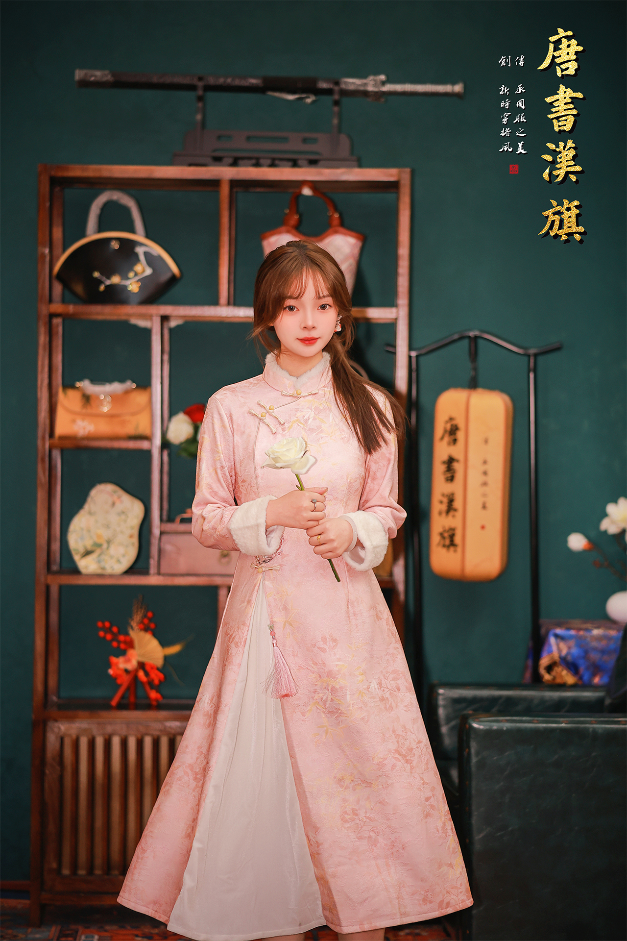 【桃苑金竹】柔粉竹韵加绒改良旗袍,立领斜襟+A字长裙,适配日常的改良剪裁,显瘦不挑身形,小个子也能穿出优雅比例,淡粉底晕染竹枝暗纹,腰间绣片+流苏挂坠点缀,自带江南温婉滤镜