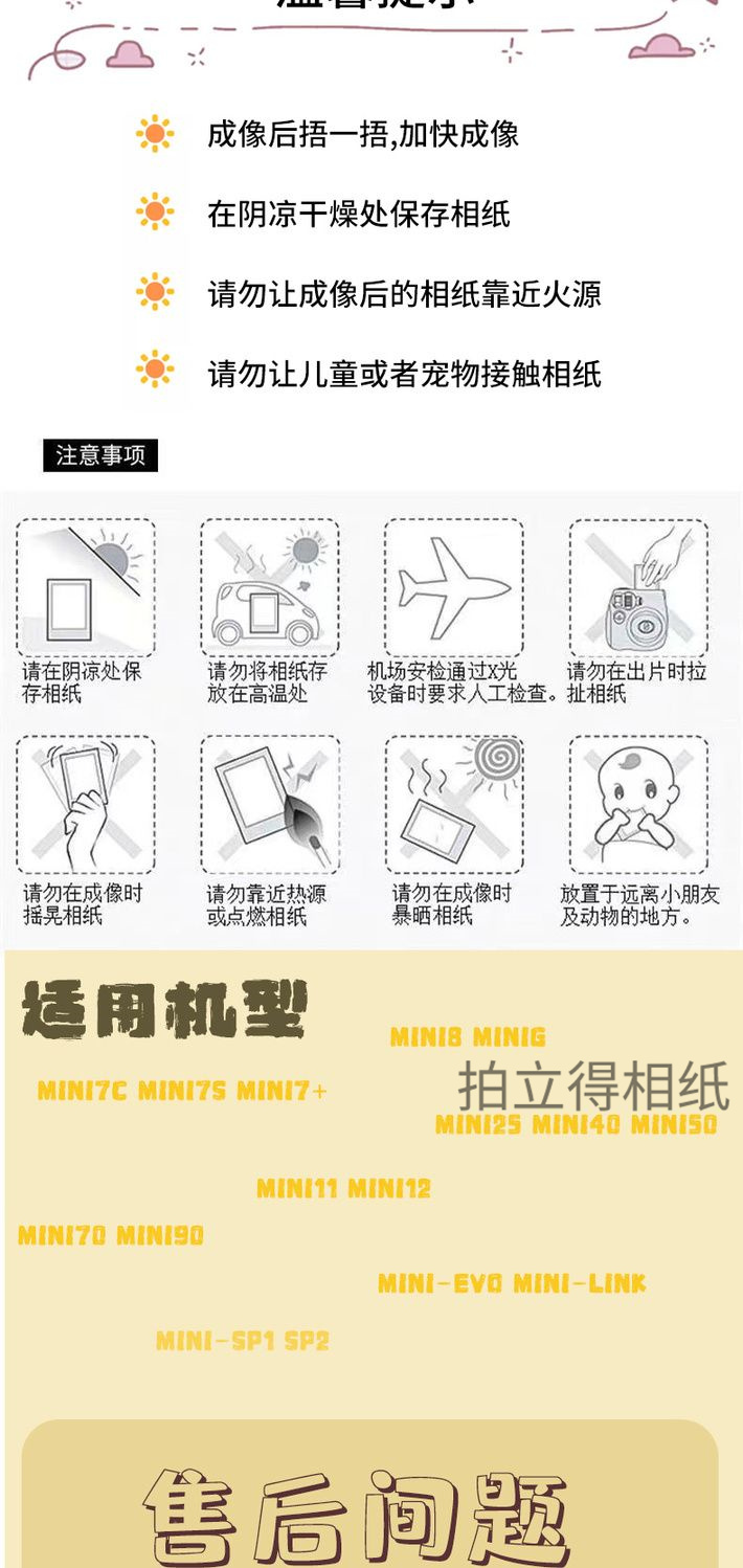 富士拍立得相纸,MINI 系列相纸多样,白边相纸适用于 MINI7 +、7s8、9、11、90、Liplay 等机型,生产时间 2025、2026 年左右。还有多种花边相纸,如手绘 kitty 猫相纸、米奇黑胶手绘 Kitty 卡通相纸、爱心相纸、迪士尼公主相纸、星星相纸、粉边相纸、黑白相纸、糖霜相纸、黑边相纸、经典黑胶相纸、花语相纸、蓝边相纸、流光相纸、马卡龙相纸、人鱼相纸、石灰岩相纸、双子星相纸、糖果相纸、天青石相纸、涂鸦相纸、维尼熊相纸、薰衣草紫边相纸。