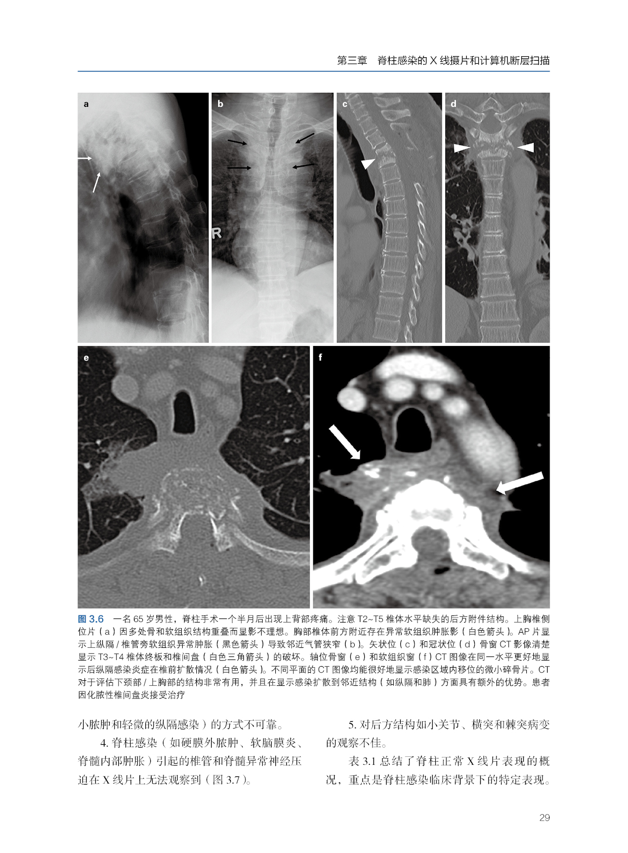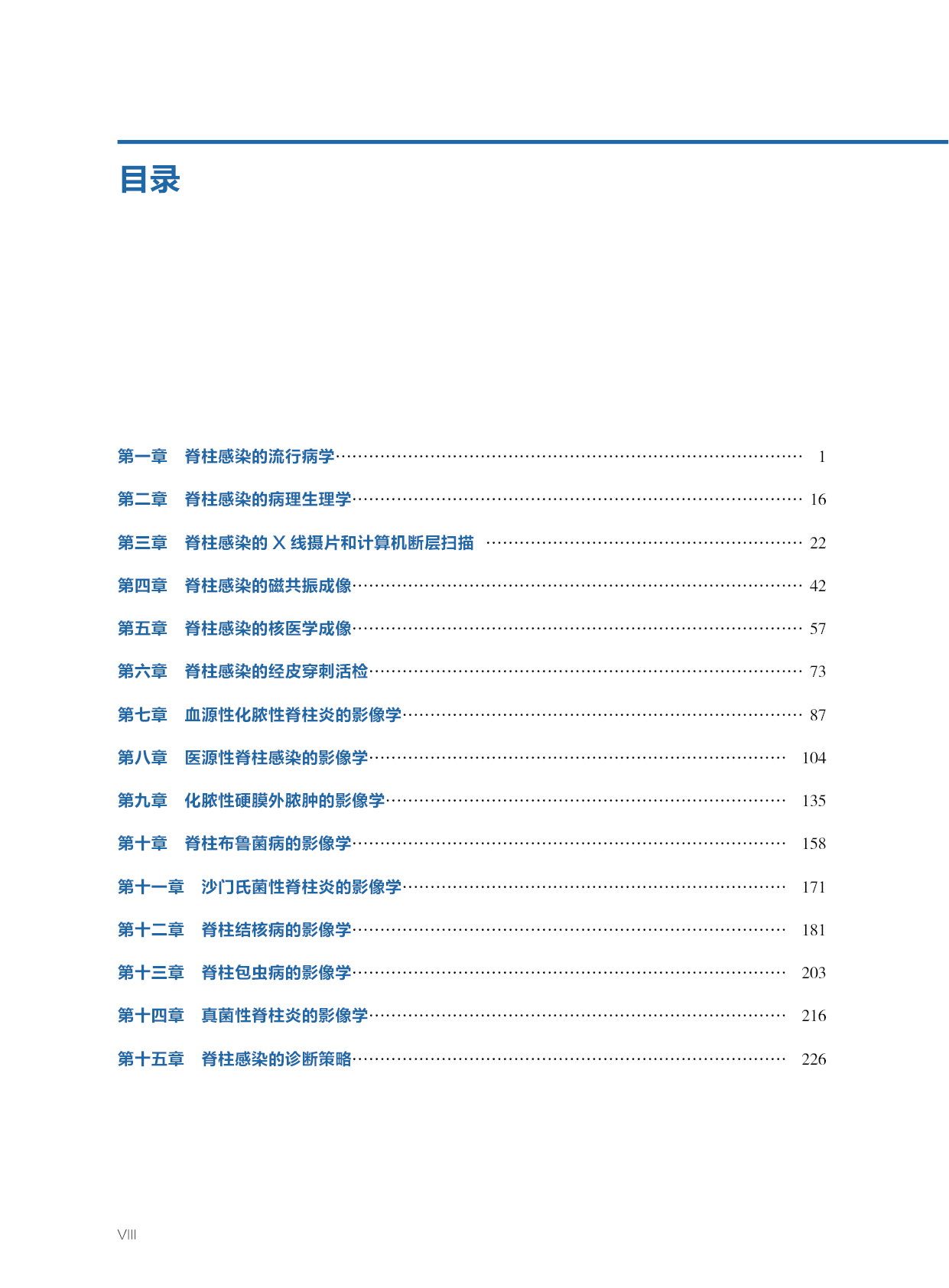 本书主要包含脊柱感染的X线摄片和计算机断层扫描、脊柱感染的经皮穿刺活检、化脓性硬膜外脓肿的影像学、影像学分析(文字分析)、影像学示意图、影像学真实临床影像图片。文字部分的讲解深入浅出,详细且非常便于理解。示意图可以更好地让读者明白和掌握,而临床图片更是将理论与临床实践紧密结合起来。