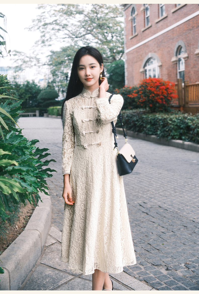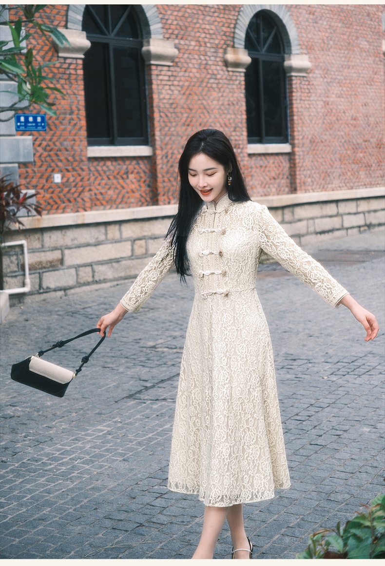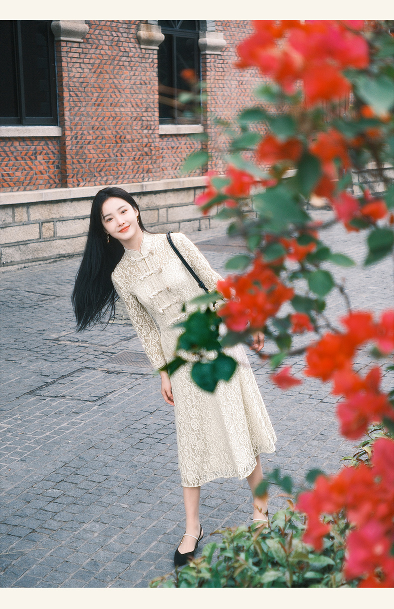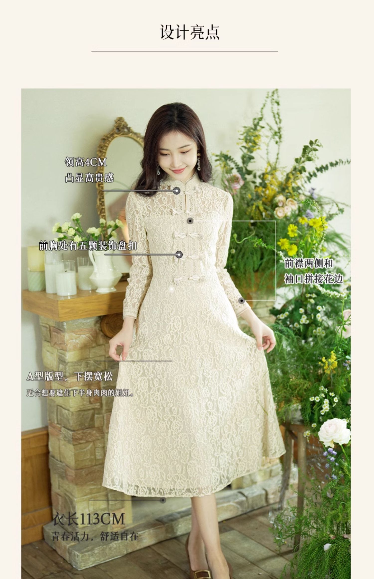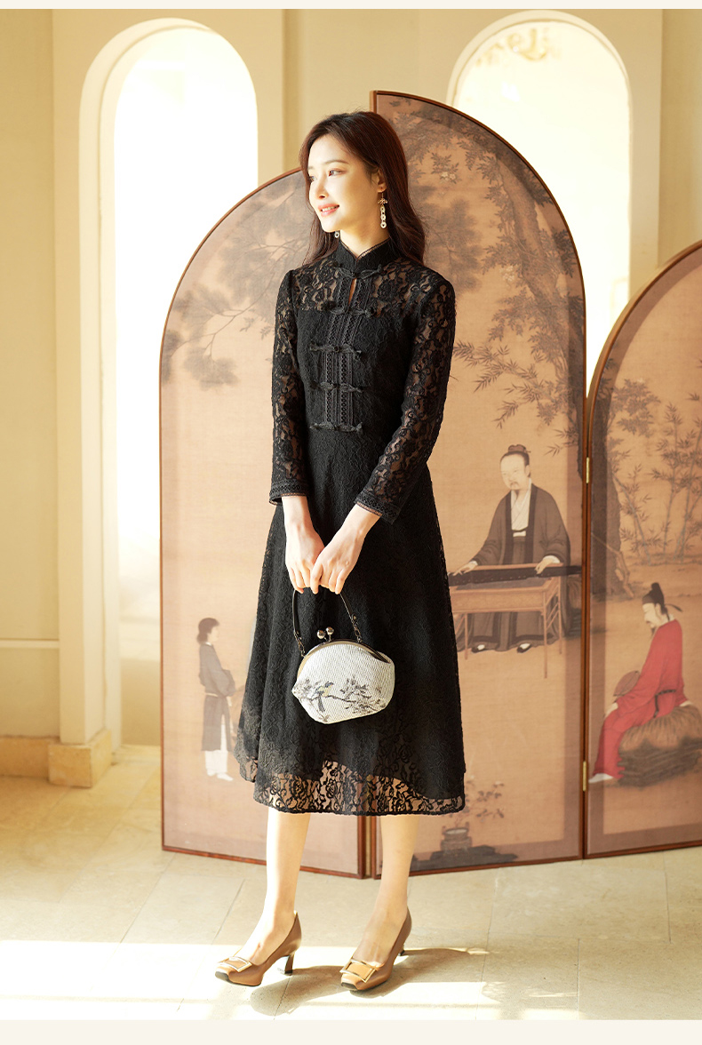 温柔暴击!!进口绒蕾丝中式连衣裙