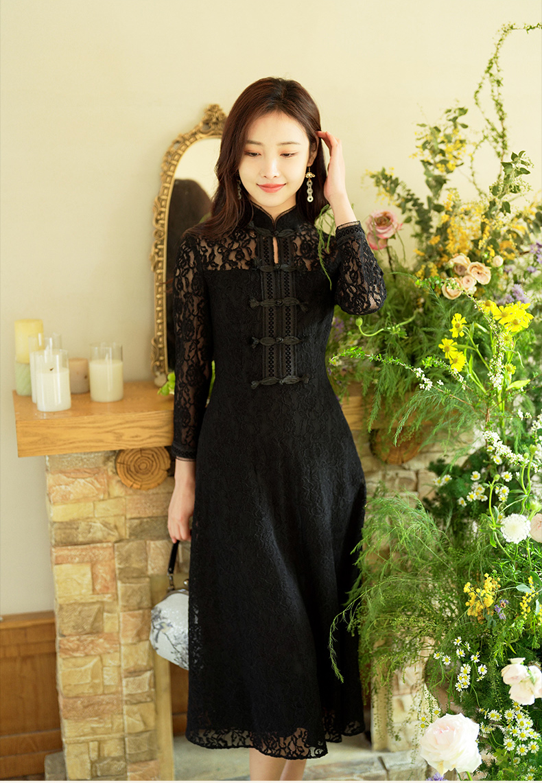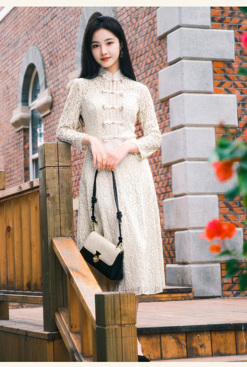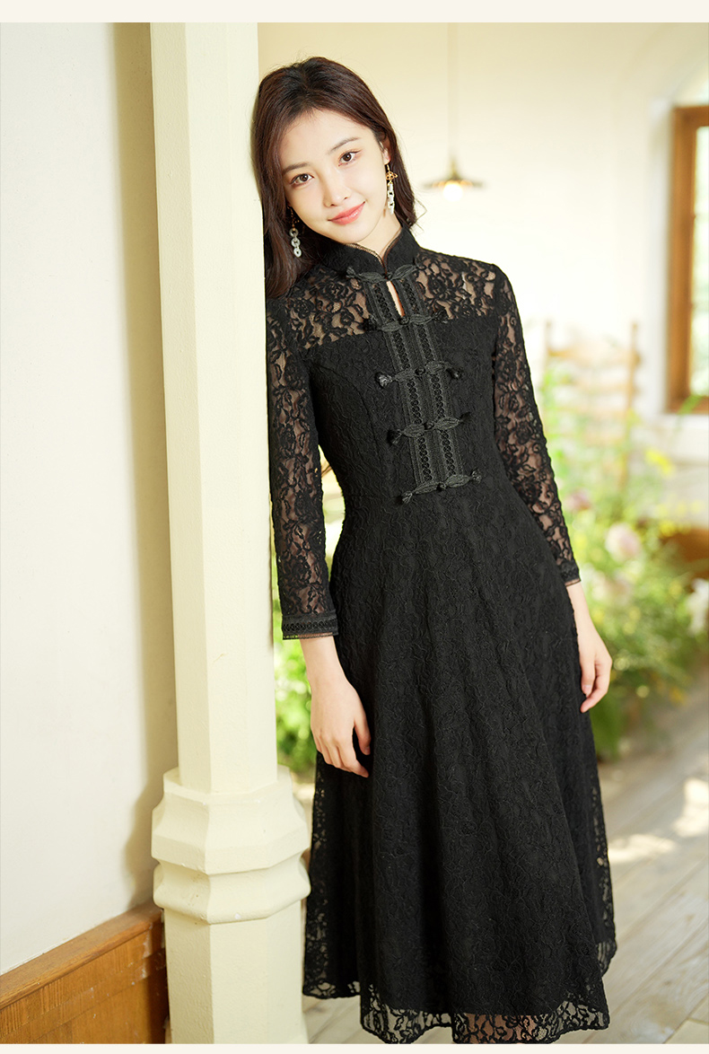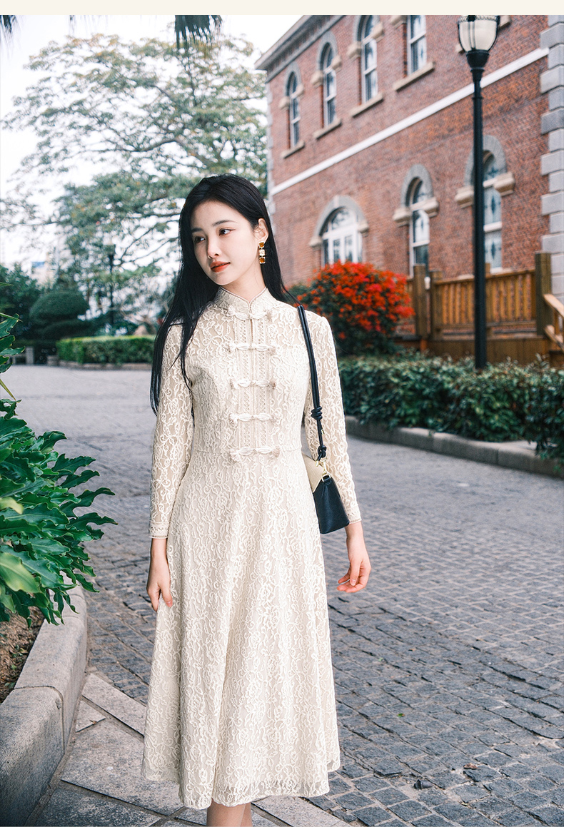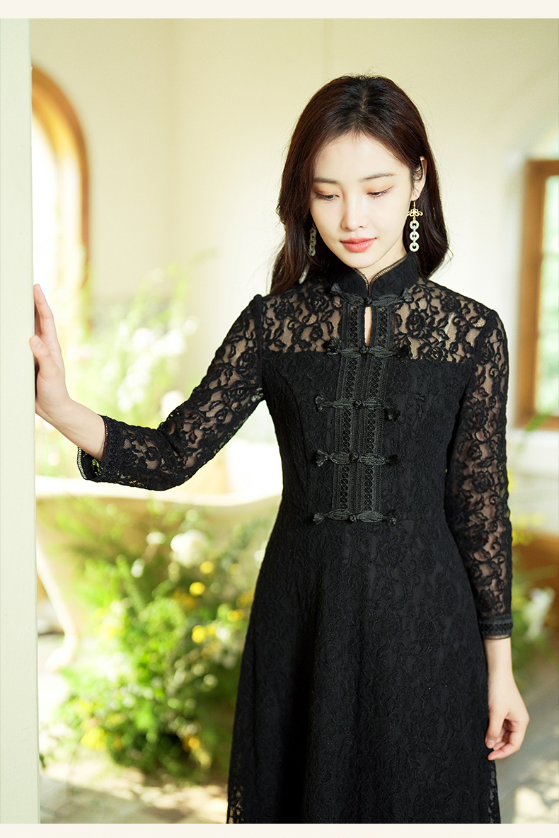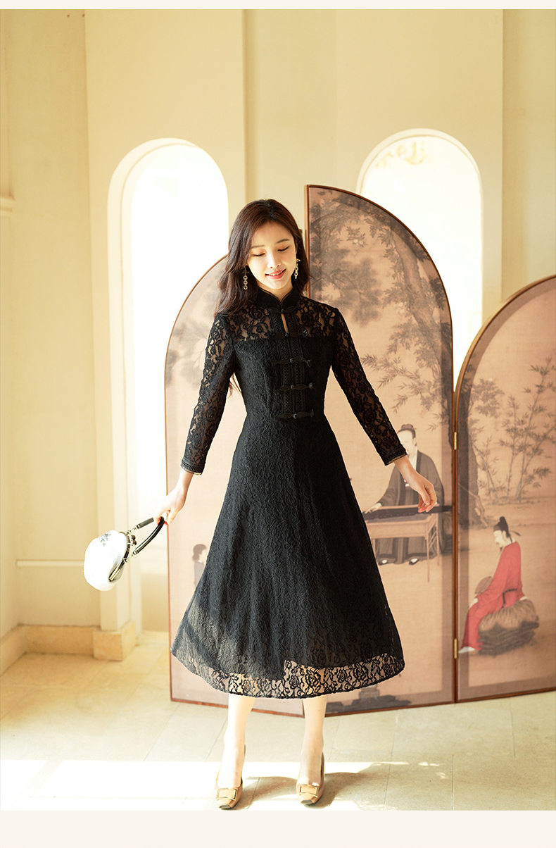 温柔暴击!!进口绒蕾丝中式连衣裙