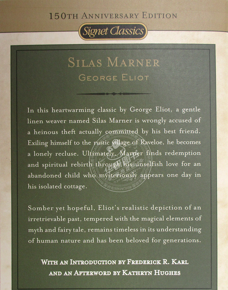 Silas Marner《织工马南》是十九世纪英国著名女作家乔治·艾略特(George Eliot)于1861年完成的作品,该作品是艾略特基于对儿时乡村生活的回忆写成的三部小说中的一部(其余两部分别是《弗洛斯河上的磨坊》和《亚当·贝德》),描述了一个名叫西拉斯·马南的纺织工一生的坎坷经历的故事。乔治·艾略特是维多利亚时代英国三大小说家之一(狄更斯、艾略特和萨克雷),作品中她以写实的笔触,对社会现况做出毫无保留的揭露,并对当时陈腐的道德评断寄予高度的质疑。