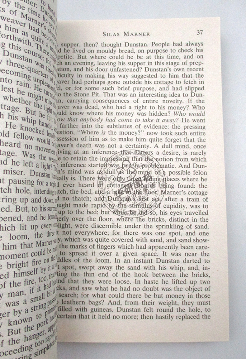 织工西拉斯·马南就很古怪。他独自居住,没人知道分的家庭情况如果你不知道分的父母是谁你怎么能够信任他呢?他脸色苍白,眼神怪异,并且总是瞪着眼睛,因为他每天都要在织机上干很长时间的活,甚至星期天也干,而星期天他应该去教堂。他一定是魔鬼的朋友,村民们相互这么说。