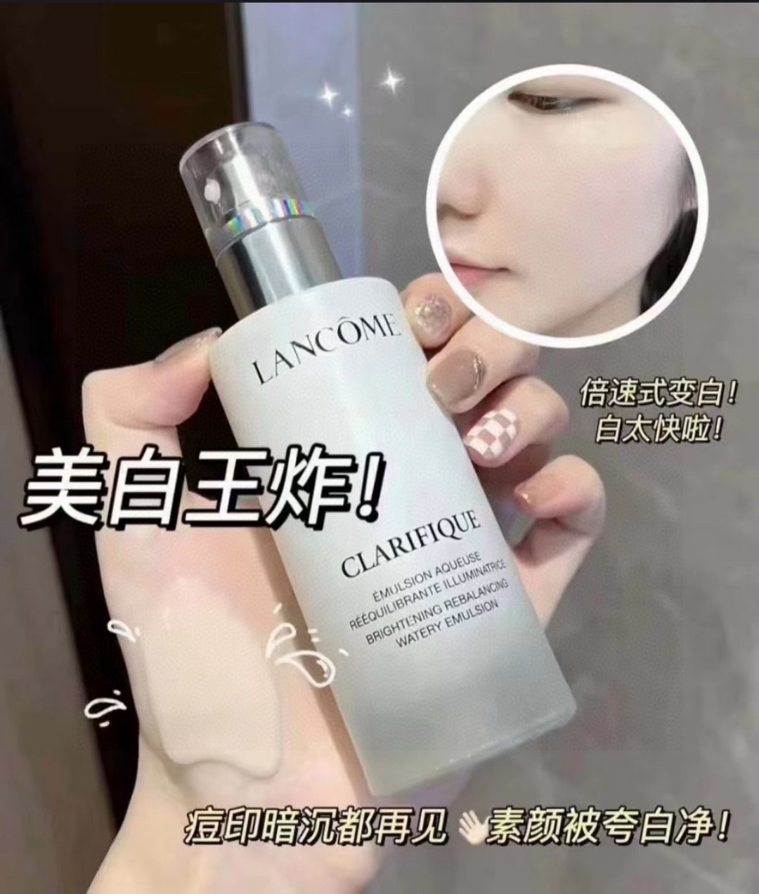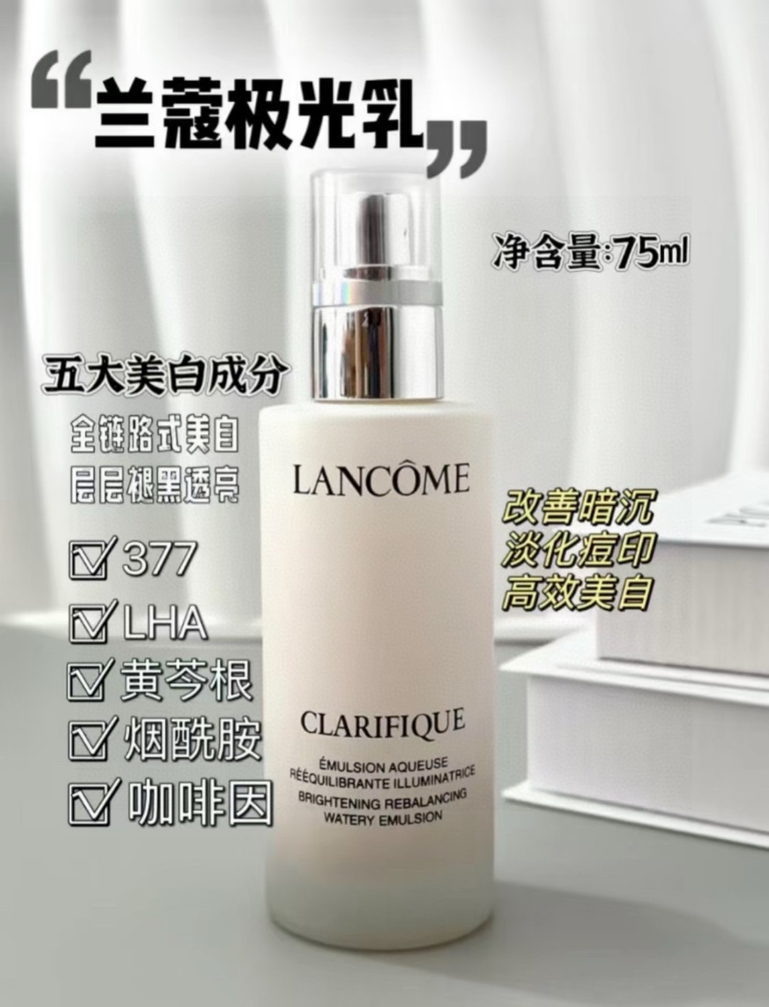 兰蔻极光精华乳液75ML高版本配专柜手提袋 海南免税袋 结合了五大美白成分,熟知的烟酰胺,377以及咖啡因,黄岑根,LHA,既不会光敏也不会刺激,还能从根源上阻断黑色素的生成,帮助皮肤抗氧化,从而做到高效美白!使用下来明显感受到气色变好,整体的肤色有了提亮!