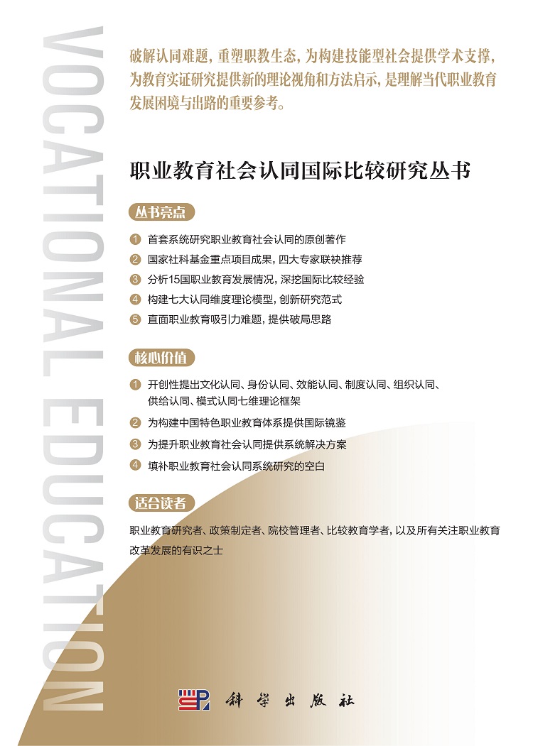 职业教育制度认同是职业教育社会认同的根本,它直接决定着制度执行的成败。以构建法律制度为方向、以创新资历框架制度为关键、以建立技能制度为基础、以完善证书制度为抓手是提升职业教育制度认同的实践路向。本书选取了美国、新西兰、英国、德国、日本等15个职业教育发展较好的国家作为研究对象,对其职业教育制度认同进行分析,以期为我国国家资历框架建设以及职业教育制度认同提供参考和借鉴。