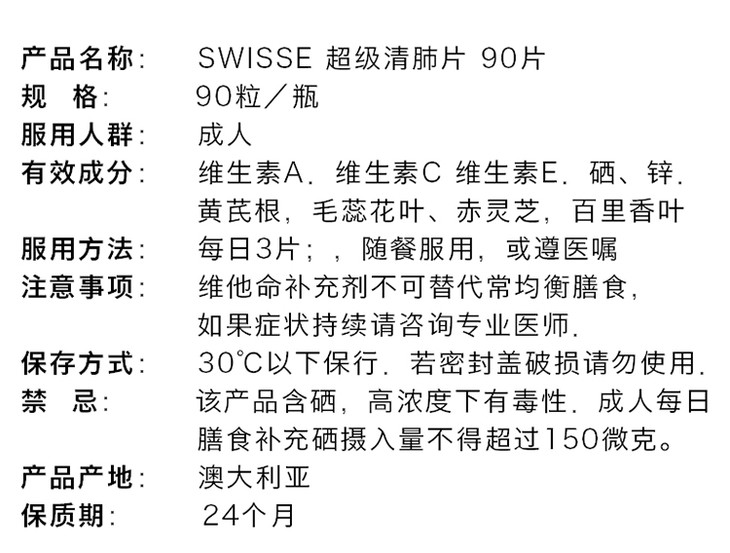 (永久下架)澳洲Swisse瑞思 清肺灵 90粒