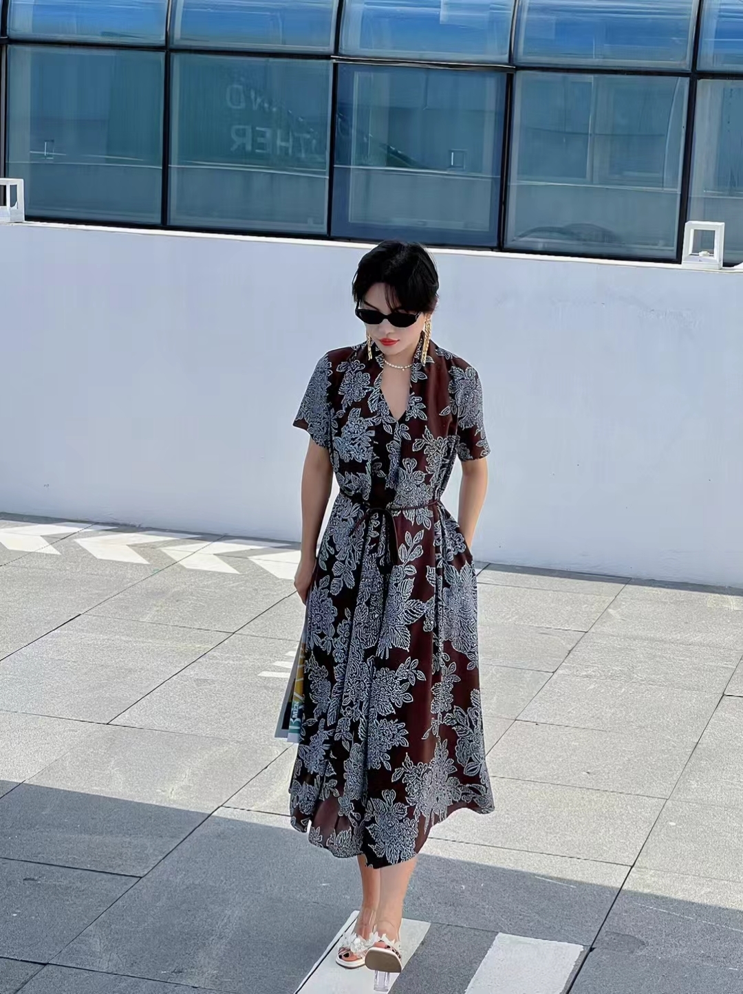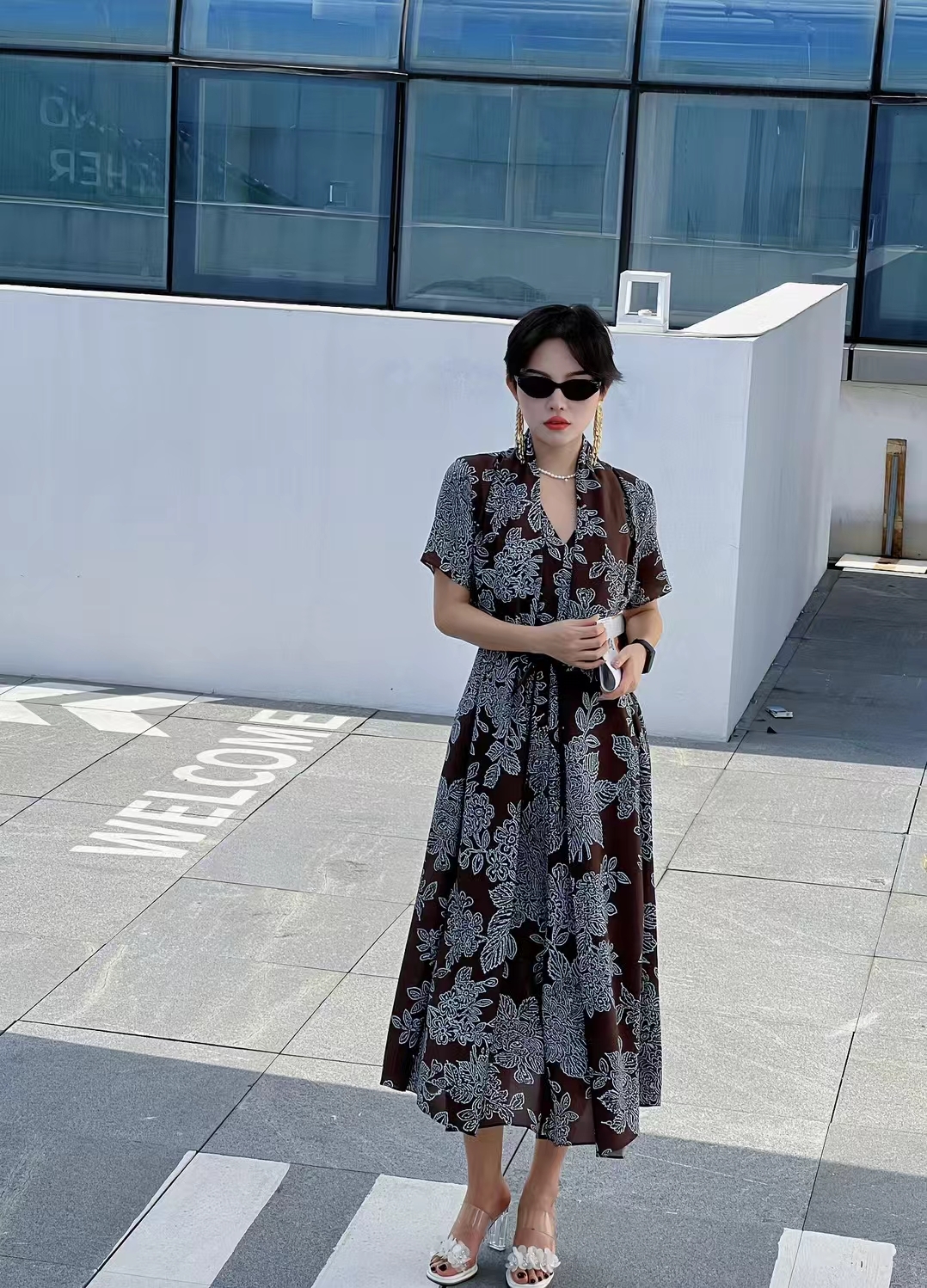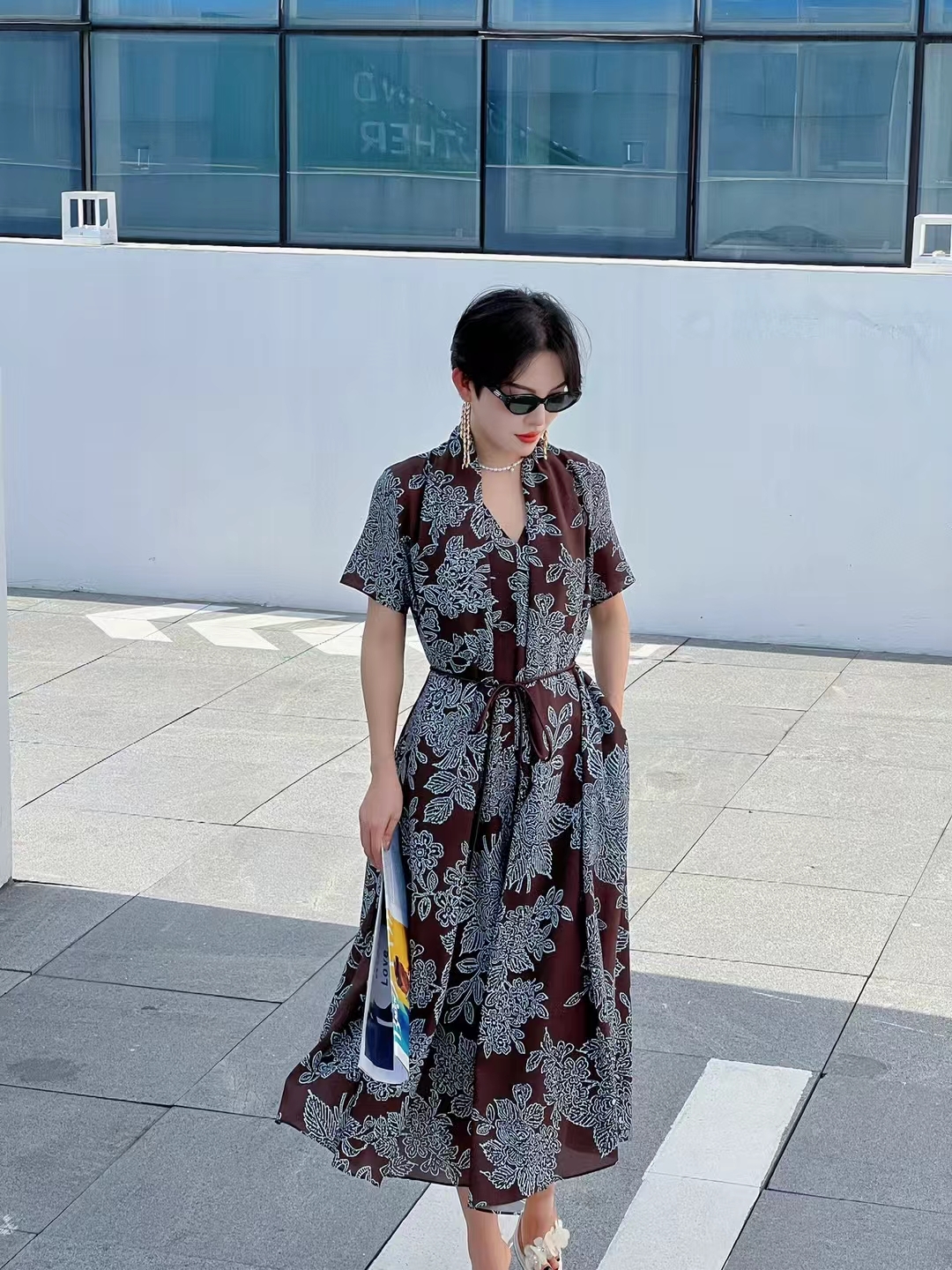 港风复古印花V领收腰长裙SZ2S92-青骊