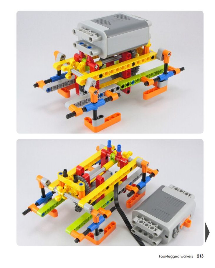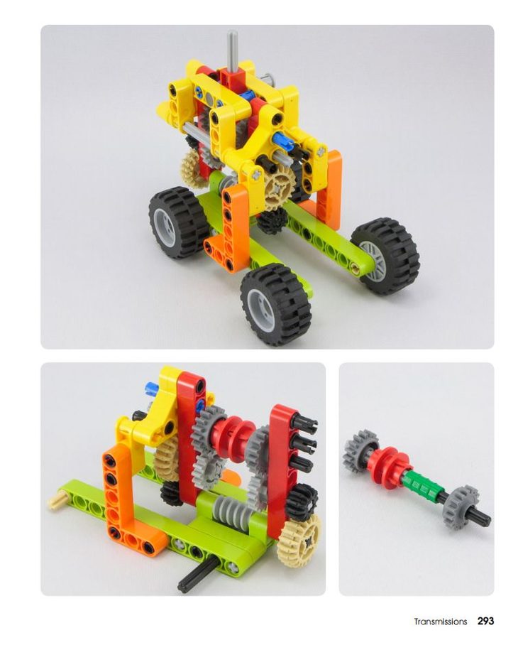 ▷ 《乐高动力组创意搭建指南:机械结构篇》则讲解传动结构,从加减速、蜗杆、转盘、齿轮、万向节、链条、履带、橡皮圈、齿条、凸轮到连杆等等,基本上我们日常生活中常见的传动结构都讲到了,每一种结构他也举了很多例子。