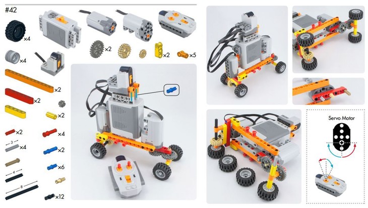 每一个造型都是根据机械原理精心设计,呈现出丰富巧妙的运动方式,涵盖50+物理知识,如电机驱动、转向、差速器、履带、减震系统、往复运动、六足移动、振动前进、间歇运动、变速箱、齿轮传动等。