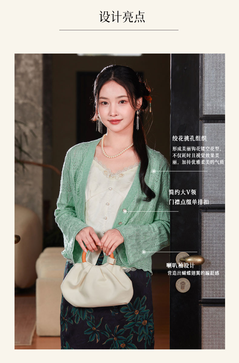绞花挑孔组织,是春日里的精致笔触。美丽的钩花镂空花型,每一针每一线都凝聚着匠心。