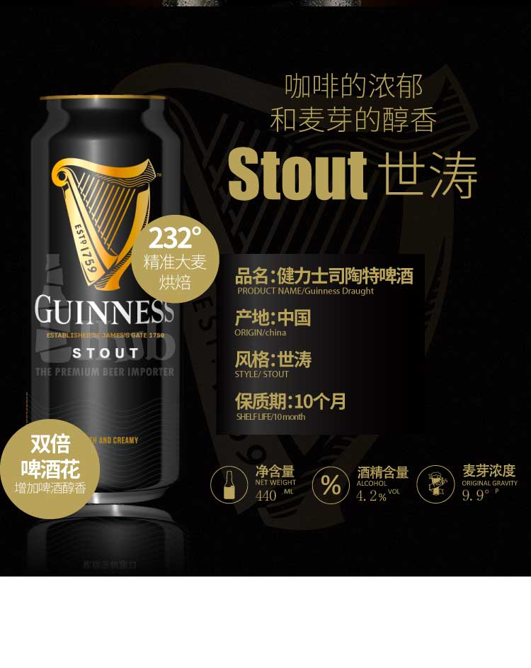 国产健力士氮气黑啤罐装世涛啤酒 4.2%vol