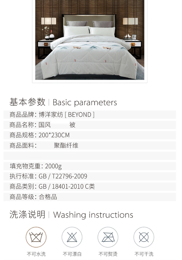 博洋国风纯羊毛被 规 格:200*230cm 面料:100%聚酯纤维 填充物成分:100%羊毛 填充物克重:2000g