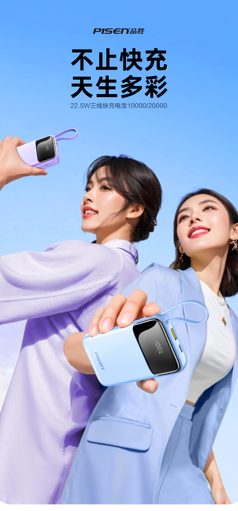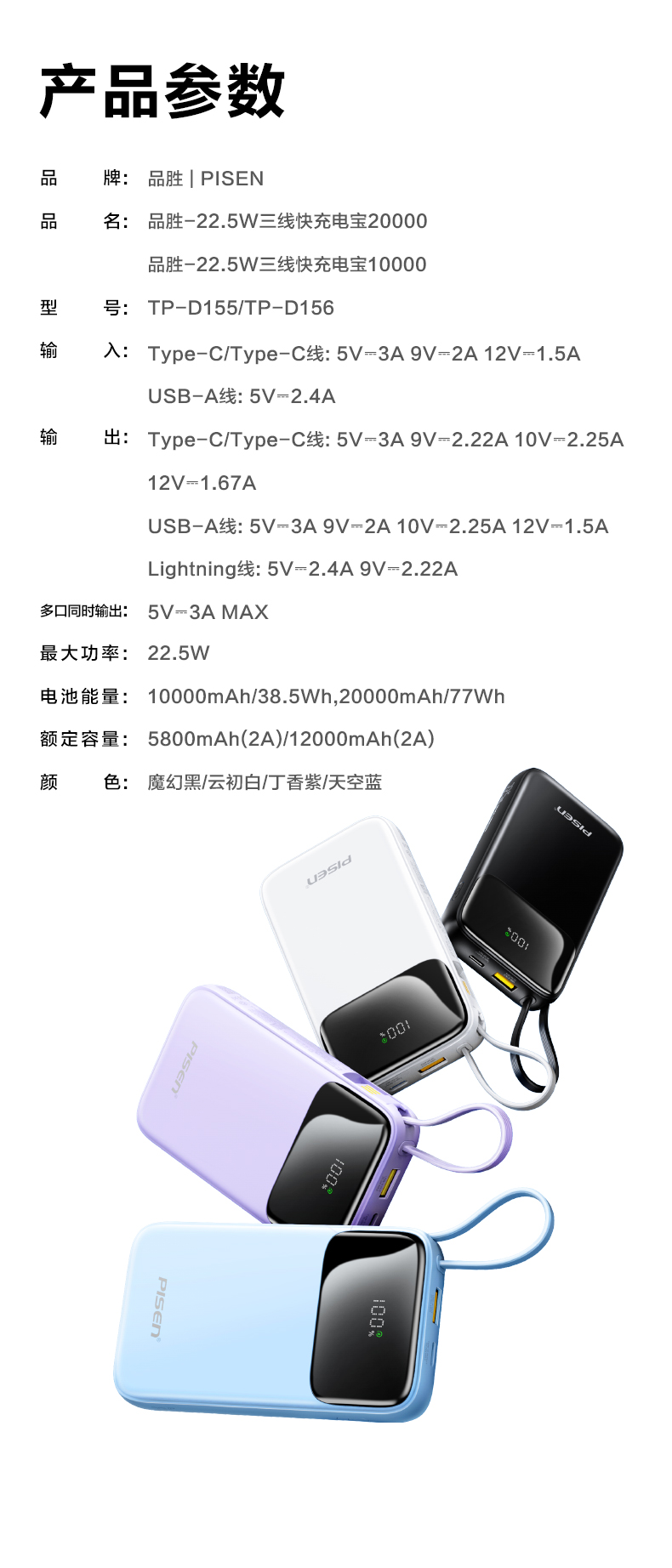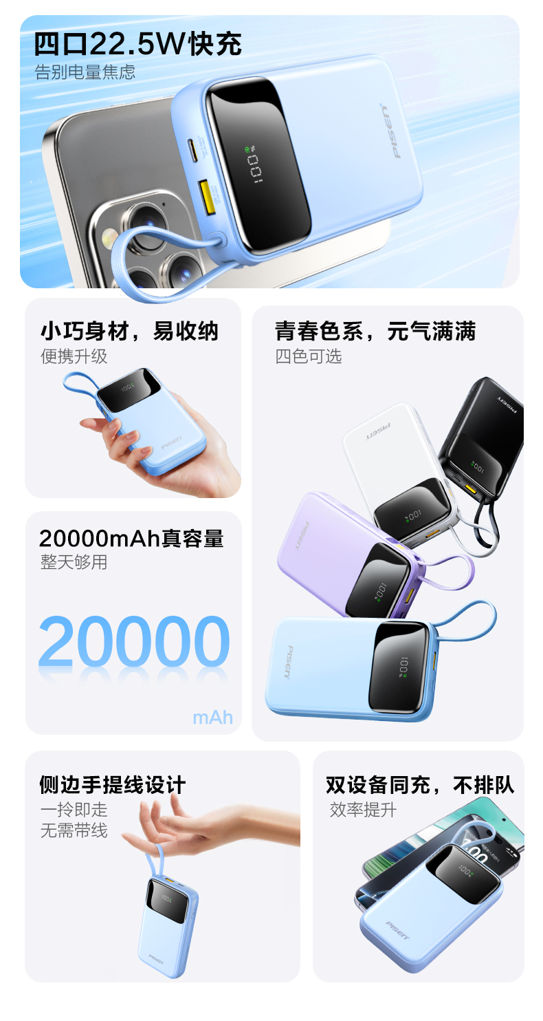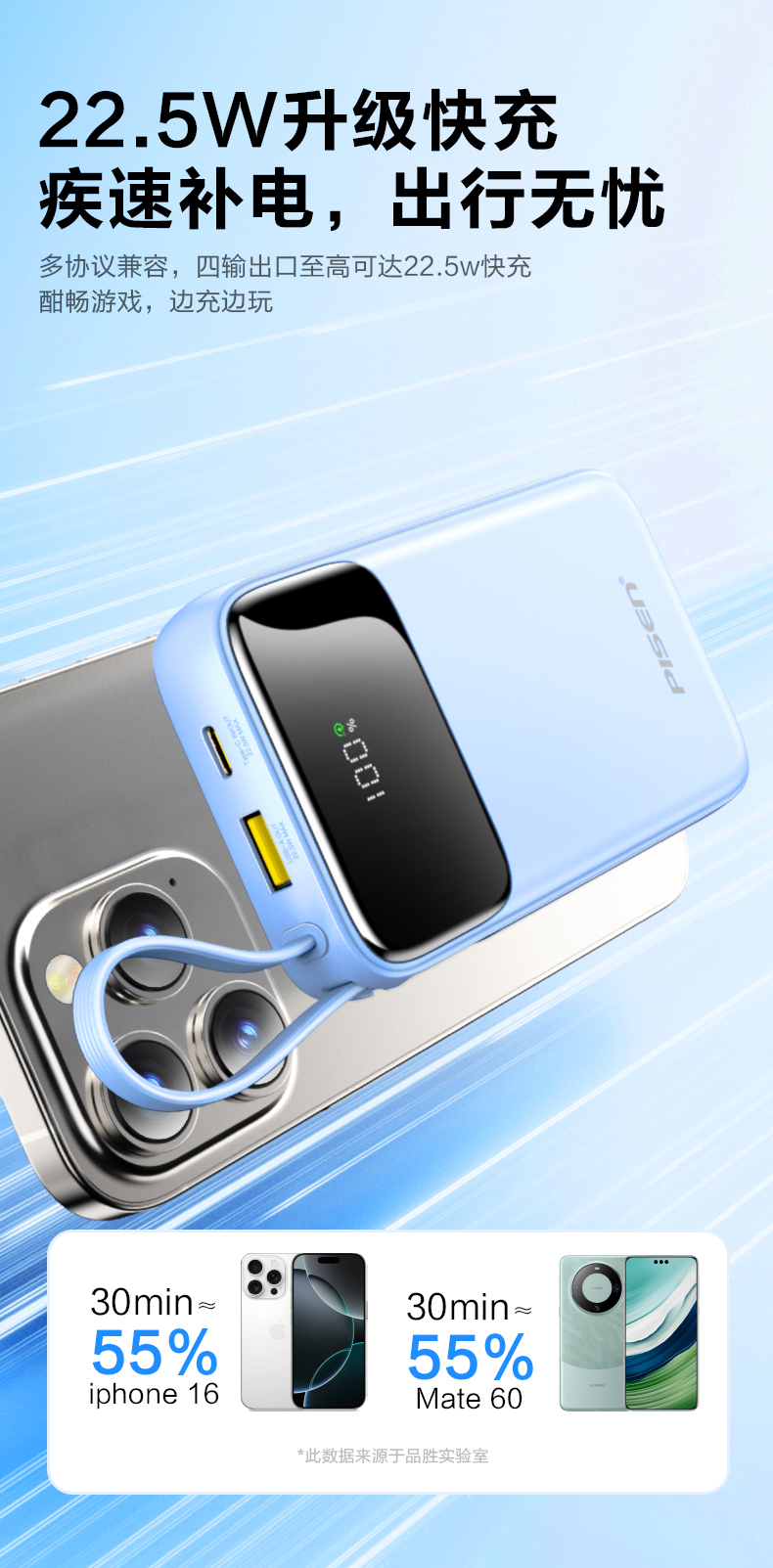 品胜 22.5W三线快充电宝20000毫安 大容量 22.5W快充移动电源适用苹果/华为/小米