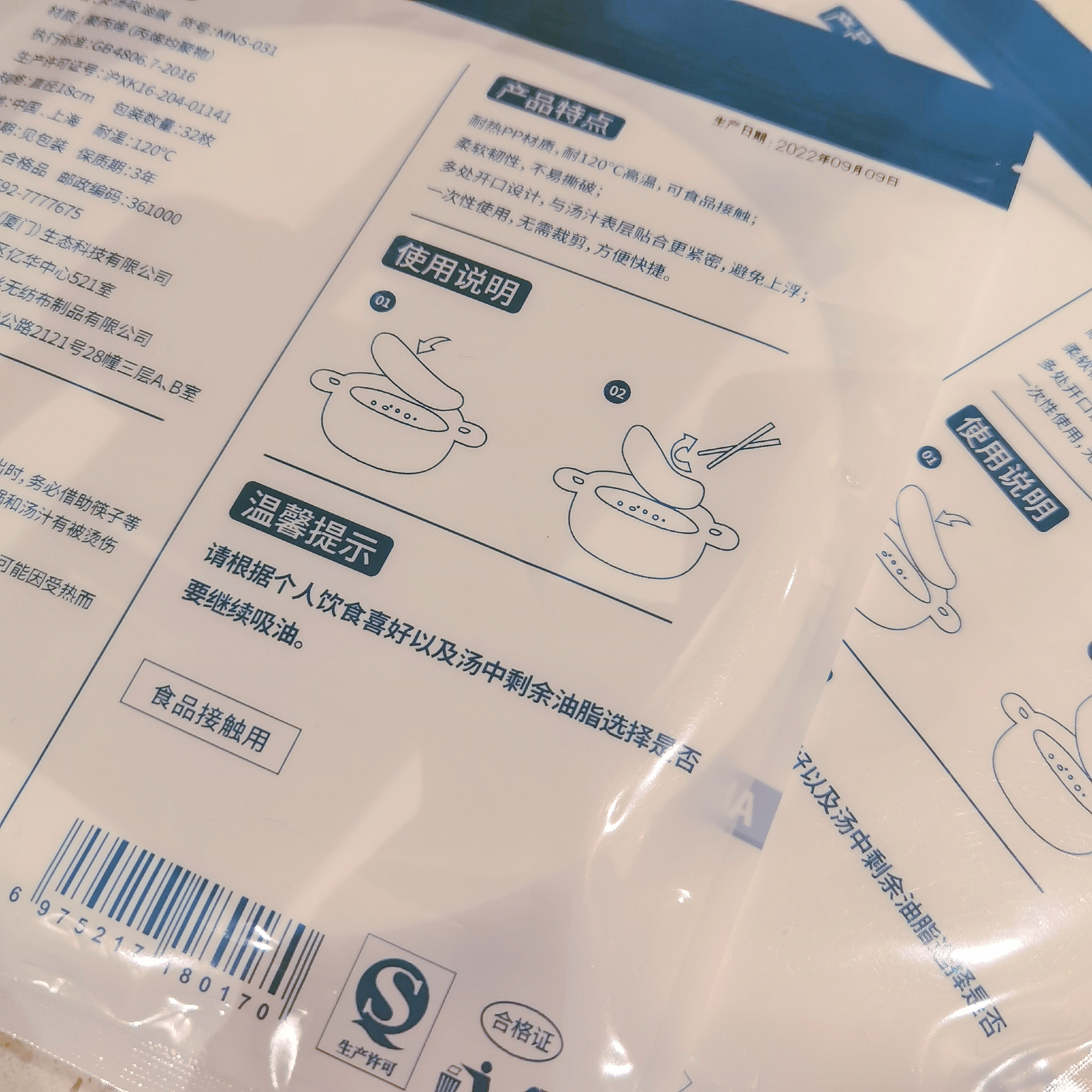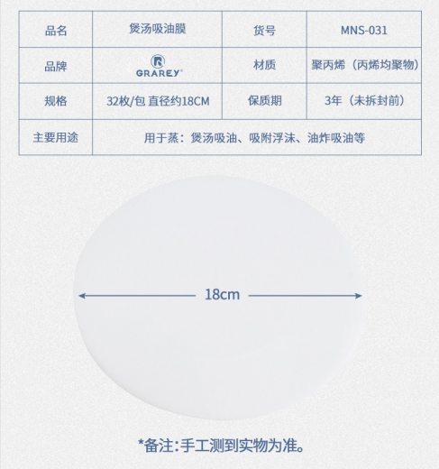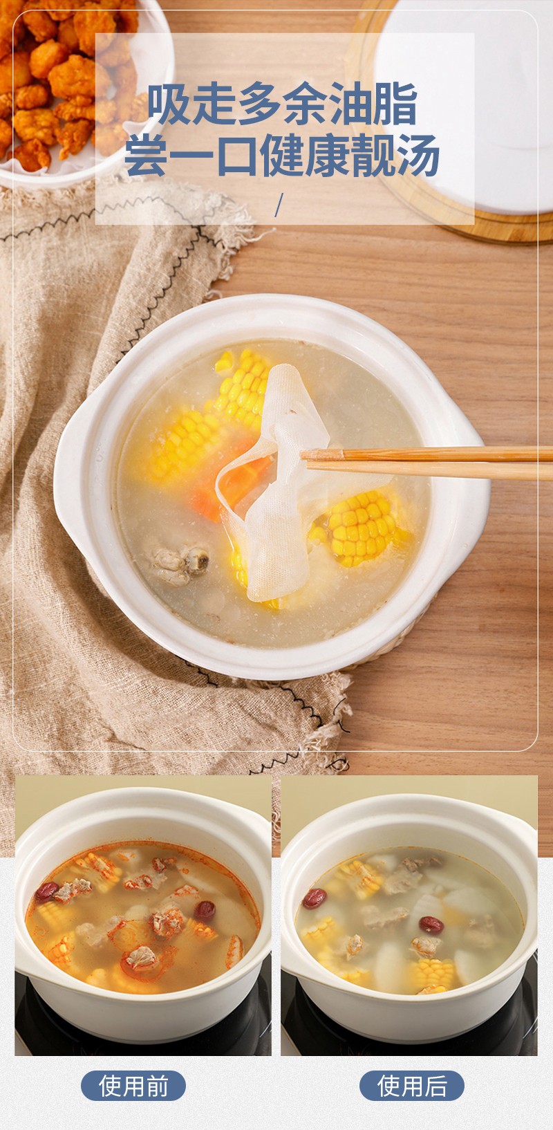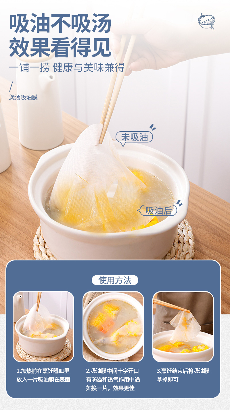 GRAREY吸油膜采用PP食品级无纺布作为原料,不掉絮,不掉毛,肉眼就能看到的过硬质量:边缘裁剪整齐、不毛糙;跟常见吸油膜不同,中间和两边特意做了十字开口,防止上浮或者溢锅;因为耐高温而且性能稳定,PP材质的吸油布经得住长时间蒸煮,即使在煲汤前放进去都可以,掀开锅盖把废布扔掉,就是一锅清淡美味的健康汤!