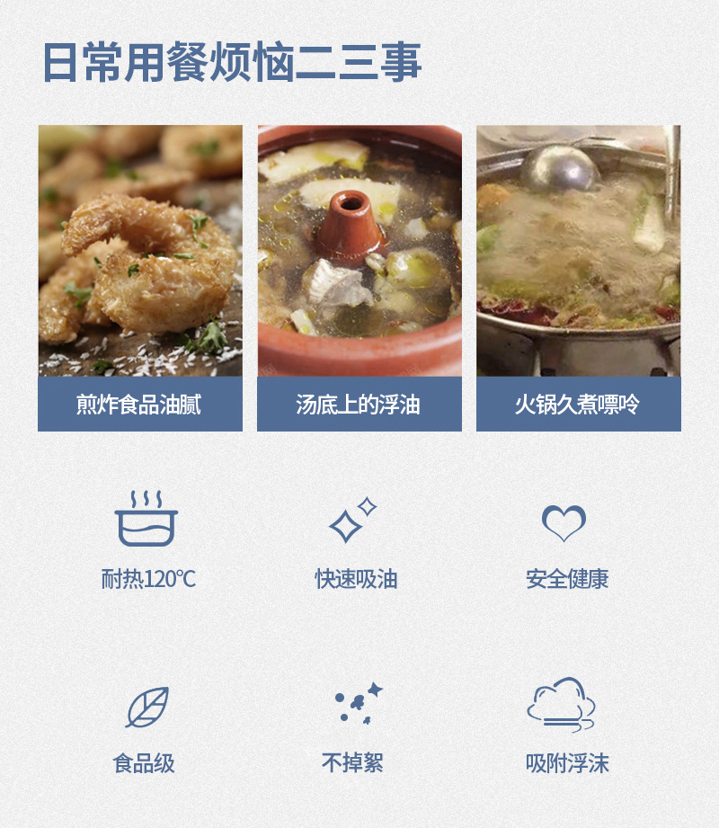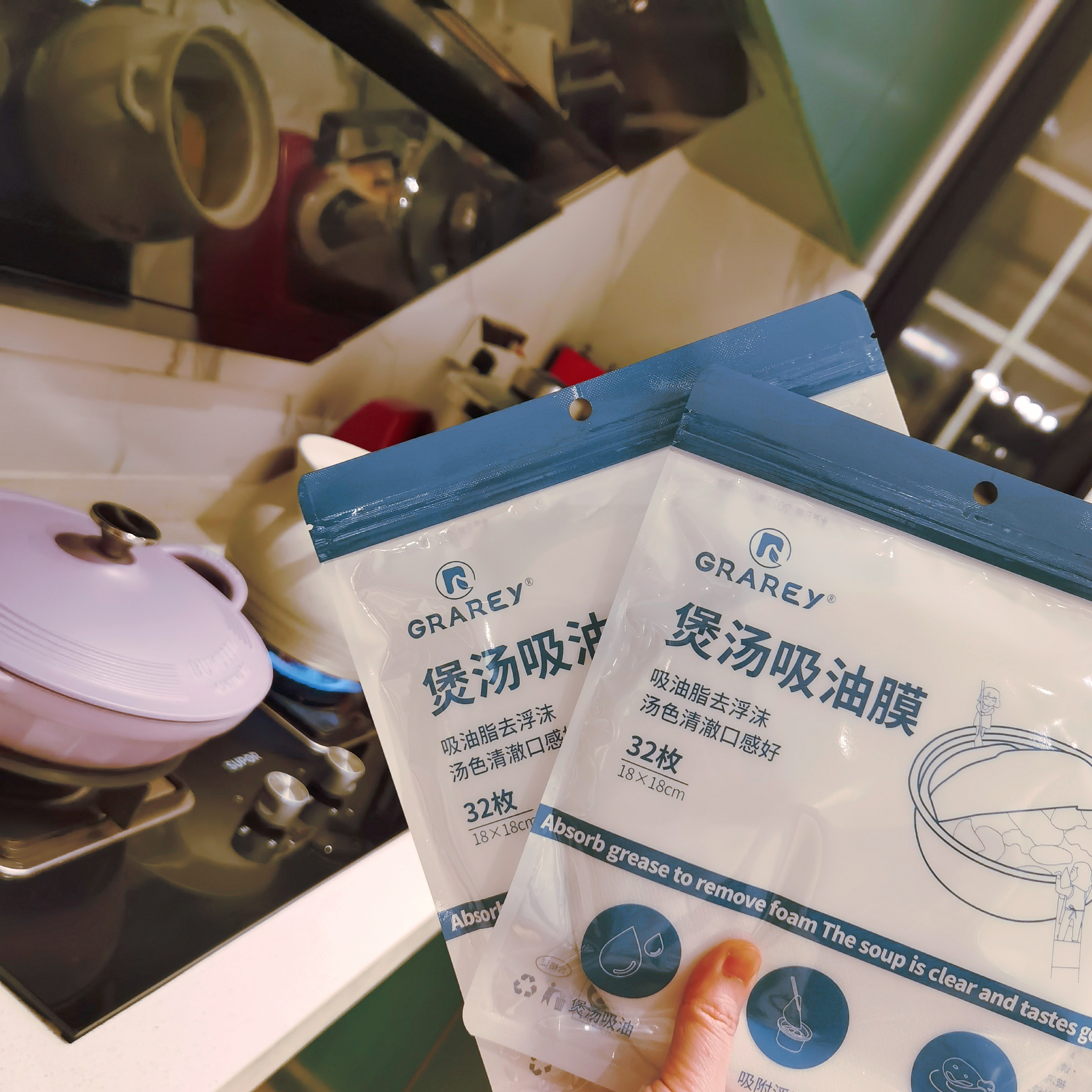 吸油纸其实不是什么新鲜玩意,很多厨房品牌都会搭配着出一款,只是品质还是有不同。GRAREY吸油膜,很用力扯也不会掉屑屑,可以安心喝汤!过年时陆老师炖的老母鸡,用掉了好几张,才吸光厚厚老油!平时点外卖时,太油的也可以吸一吸,会比较健康些!还有空气炸锅出来的炸物,也能垫垫,在家吃火锅也可以随时搞定浮沫啦!