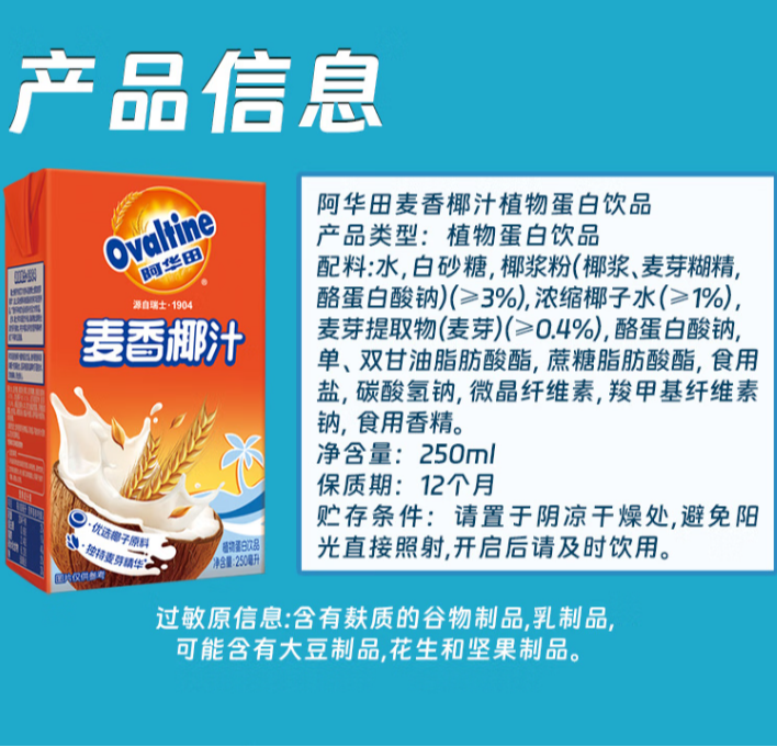 阿华田 麦香椰汁饮品250mlx18盒(箱)