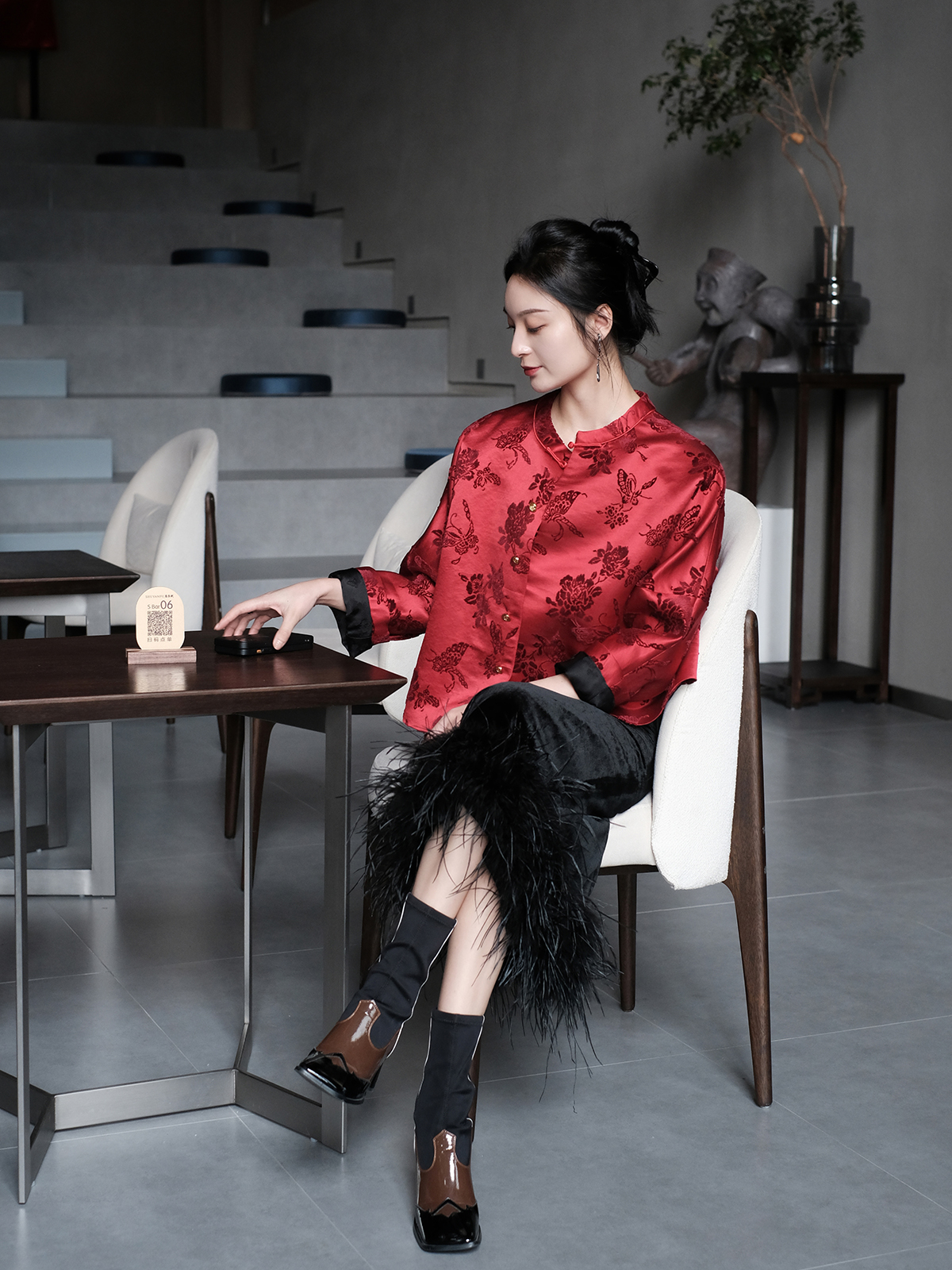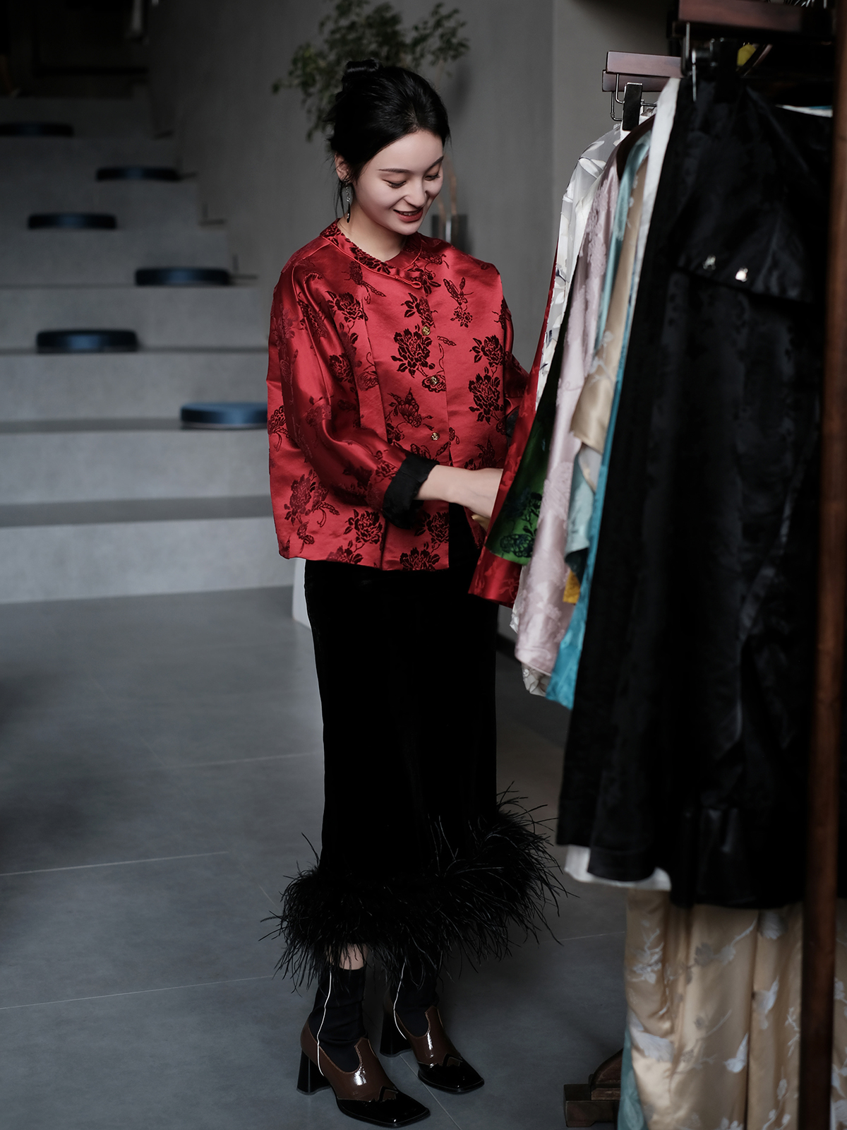 盛唐牡丹 |真丝漳绒圆领外套 (蝶恋花红色)
