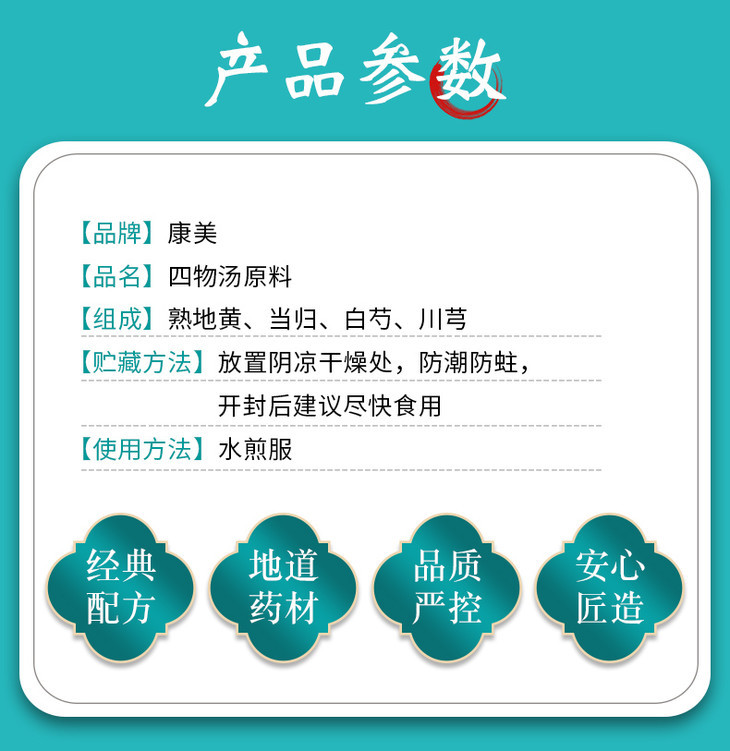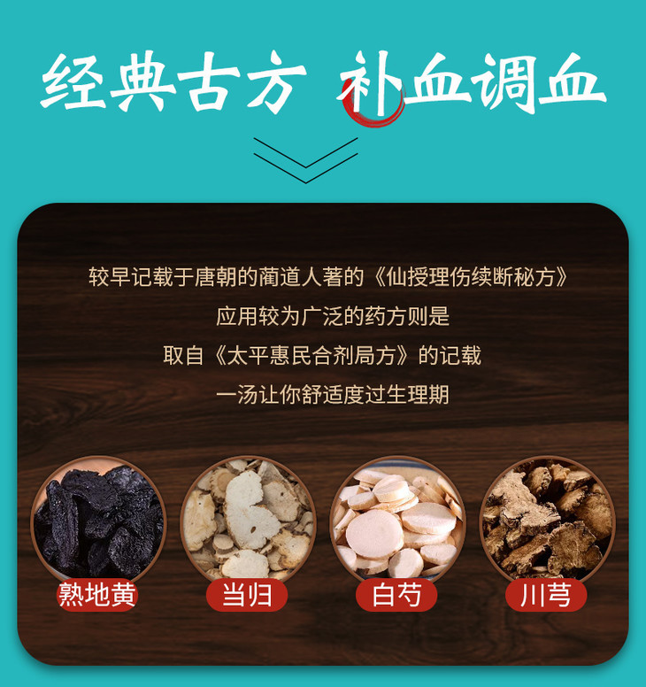 四物汤 36g/剂(熟地黄/当归/白芍/川芎)出自《太平惠民和剂局方》