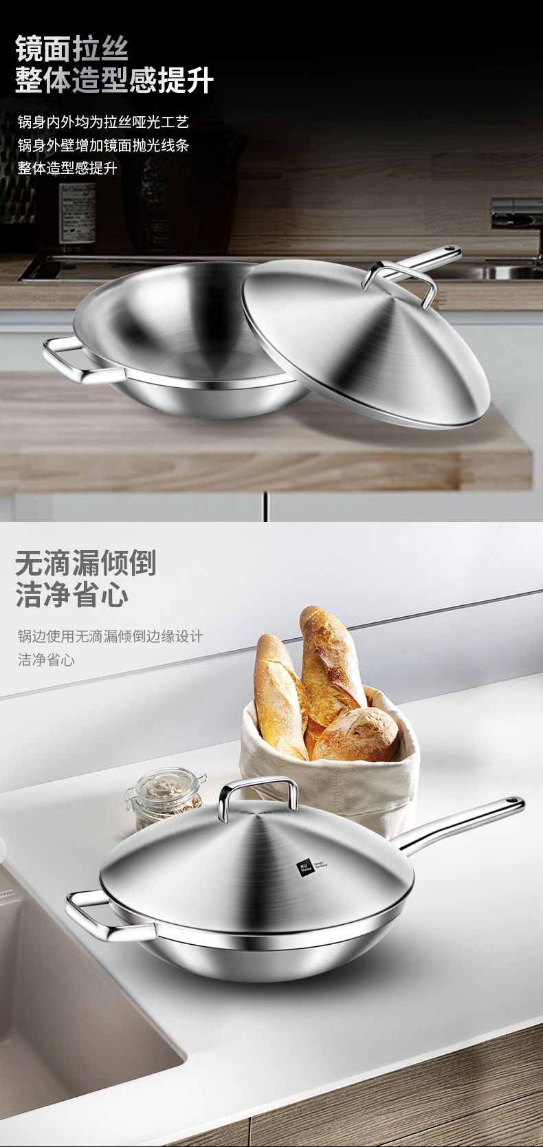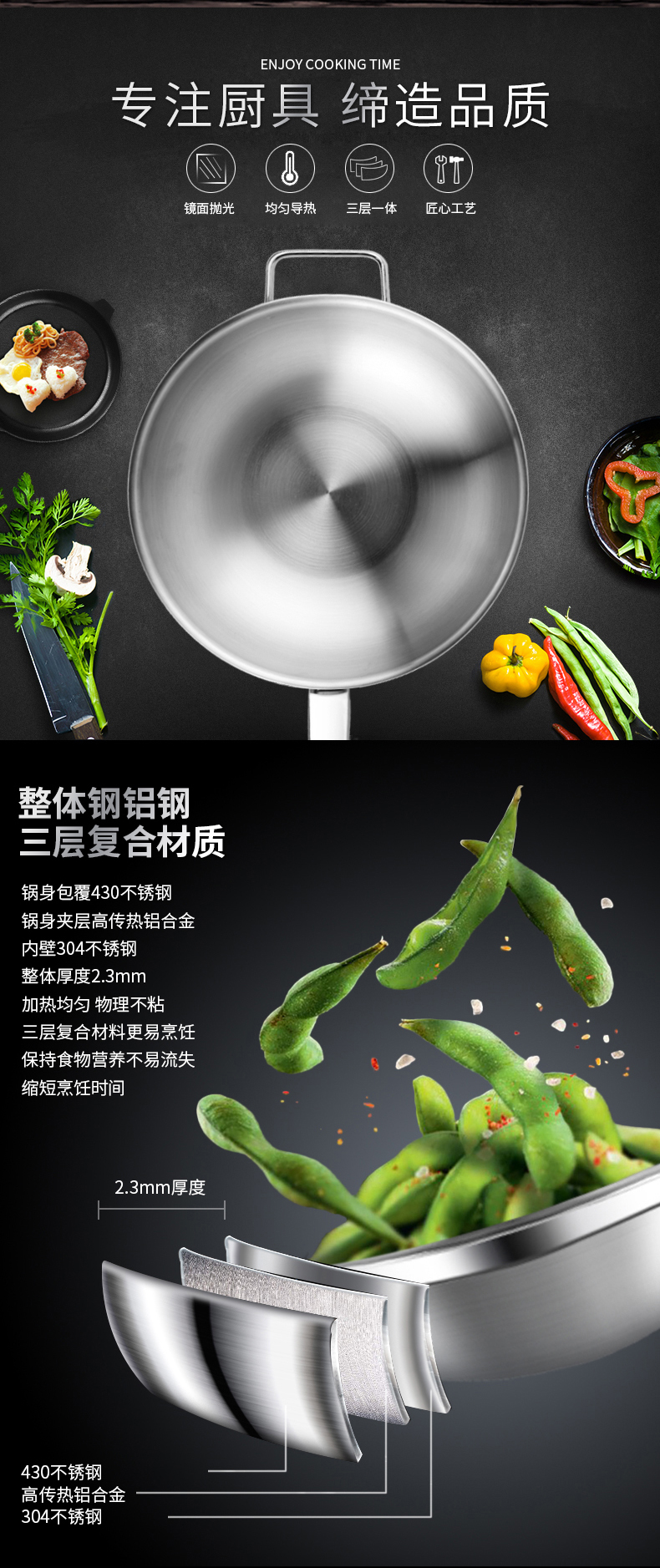 整体钢铝钢三层复合材质,锅身包覆430不锈钢(高导磁不锈钢),适用于包括电磁炉在内的任何炉具(电磁炉/电陶炉/燃气灶都适用);锅身夹层高传热铝合金,内壁304医用级不锈钢,锅身壁厚达到2.3mm,耐腐蚀性强,加热均匀,物理不粘。三层复合材料更易烹饪,保持食物营养不易流失,并且缩短烹饪时间,更节能。锅身钢铝钢三层一体成型,利于烹饪,内外均为拉丝哑光工艺,外壁增加镜面抛光线条,彰显绅士风范。锅边使用无滴漏倾倒边缘设计,洁净省心。手柄使用不锈钢材质,中空隔热,点焊工艺,无铆钉更易清洗且线条流畅美观,锅盖使用无缝不锈钢盖,无水烹饪,密闭性强,烹饪效果出众,食物营养更佳。
