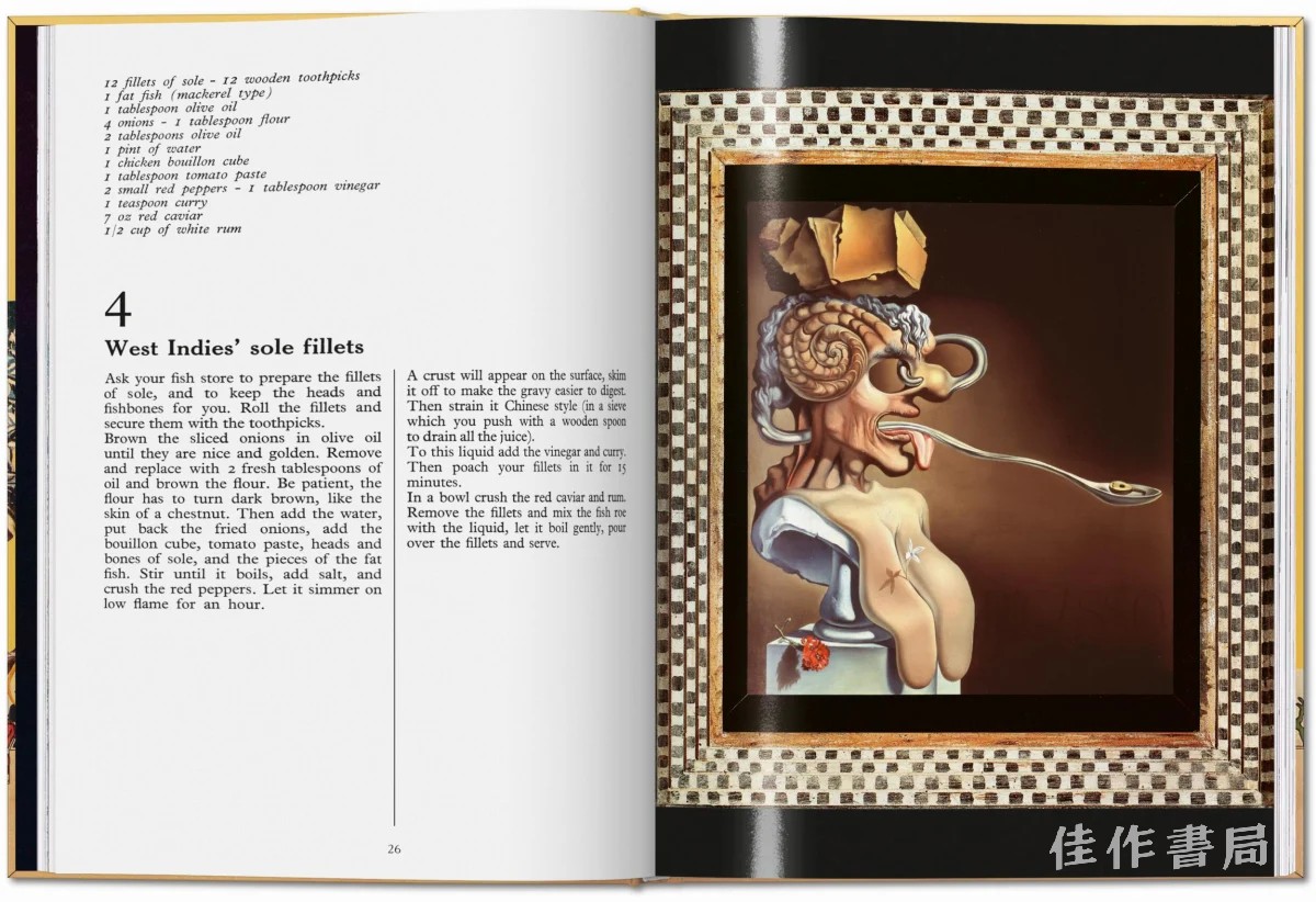这个节选重印版本收录了12个章节中的78道食谱,配有达利专门绘制的插图,并按用餐顺序编排。这些插图和食谱还附有达利关于诸如餐桌谈话等话题的夸张沉思:“下巴是我们掌握哲学知识的最佳工具。”