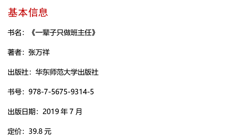 张万祥享受国务院政府特殊津贴专家,德育特级教师,国家级班主任培训主讲专家。近年间,主编出版了“班主任千字妙文系列丛书”,以及《幸福教师的60个“不”》《这样做,教师更幸福》《班主任工作创新艺术100招》《教师专业成长的途径——30位优秀教师的案例》等。开创了网络招收徒弟的先河,被誉为“网星”“青年班主任的真诚朋友”。