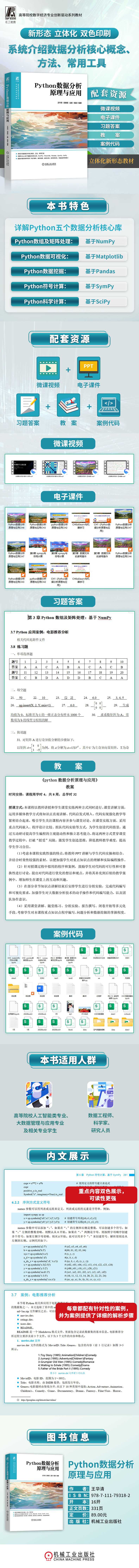 随着信息技术的飞速发展,数据已成为推动社会进步与经济发展的关键要素,数据分析已成为驱动创新与决策的核心引擎。近年来,我国;十四五规划明确提出;加快数字化发展,建设数字中国的战略目标。《;十四五大数据产业发展规划》更将数据定位为关键生产要素,强调通过技术创新与产业融合释放数据价值。与此同时,《关于构建数据基础制度更好发挥数据要素作用的意见》(又称;数据二十条)等政策持续完善数据基础制度体系,推动数据要素市场化配置改革,为数据分析技术的应用开辟了广阔空间。在此背景下,掌握数据分析技能变得尤为重要。Python作为一种功能强大且广泛应用的编程语言,凭借其简洁易读的语法、丰富的库生态系统(如NumPy、Matplotlib、Pandas、SymPy、SciPy等)及开源社区支持,已成为数据分析领域的首选工具之一。因此,本书以Python为工具,以;理论为基、实践为用为宗旨,系统构建从基础到进阶、从工具到场景的数据分析知识体系,旨在帮助读者掌握数据驱动的思维方法,并将其转化为解决实际问题的能力。本书共7章,各章节安排如下:第1章从数据的本质出发,剖析数据分析的体系架构、核心技术,带领读者走进数据分析的世界,了解其重要性、特征、分析思维方式、层次划分以及基本流程,为后续学习奠定坚实的理论基础。第2章聚焦于Python这门编程语言,深入剖析其在数据分析中的优势、与其他工具的对比、数据分析常用库以及工作环境配置,让读者对Python在数据分析领域的地位和作用有清晰的认识,帮助读者快速入门。第3章深入探讨NumPy库的数组及矩阵处理功能。作为Python数据分析的基础工具,NumPy提供了强大的多维数组对象及各种操作方法。本章详细讲解数组的创建、属性、操作、运算等内容,包括数组的索引、切片、形状变换、广播机制等。通过丰富的实例,展示如何利用NumPy进行高效的数值计算和数据处理,为后续章节的学习打下坚实的基础。第4章聚焦Matplotlib库的数据可视化方法。数据可视化是数据分析的重要环节,能够将复杂的数据以图表形式直观地呈现出来。本章介绍Matplotlib的基本绘图函数、各种图表类型(如折线图、柱状图、散点图等),以及高级绘图技巧。通过实际案例,读者将学会如何根据数据的特点选择合适的图表类型,并进行个性化的图表定制,使数据的展示更加生动、直观。第5章详细讲解Pandas库的数据挖掘技巧。Pandas是Python中功能强大的数据分析工具,提供了丰富的数据结构和操作方法。本章涵盖Pandas的基本数据结构Series和DataFrame、数据的读取与存储、数据清洗与预处理、数据筛选与排序、分组与聚合等内容。通过实际案例,读者可以掌握如何运用Pandas进行数据的探索性分析和挖掘,从数据中提取有价值的信息。第6章介绍SymPy库的符号计算应用。在数据分析中,有时需要使用符号计算来处理数学公式和方程。SymPy作为一个符号计算库,能够进行符号推导、方程求解、微积分等操作。本章通过实例讲解SymPy的基本语法,包括符号的定义、表达式的操作、方程求解、微积分计算等,帮助读者在数据分析中更好地处理数学问题。第7章介绍SciPy库的科学计算应用。SciPy建立在NumPy之上,提供了许多用于科学计算的模块,如优化、积分、插值、信号处理等。本章选择性地介绍一些常用的模块和函数,结合实际案例,展示如何利用SciPy解决科学计算中的常见问题,进一步拓展Python在科学计算领域的应用范围。本书特色如下:? 从数据分析的基础理论到Python编程实践,从单库应用到多库协同,内容层层递进,形成阶梯式学习路径,能够引导读者系统学习和掌握Python数据分析的方法。? 注重理论与实践相结合,主要章节都配有示例代码和应用案例,帮助读者将所学知识应用到实际问题中。同时,书中还提供习题,便于读者学以致用。? 语言简洁明了,表达通俗易懂,避免了过于复杂的数学公式和理论推导,适合不同专业背景的读者阅读。同时,书中还对一些重要概念、函数和方法进行了详细解释和说明,便于读者理解和记忆。通过本书的学习,读者将掌握数据分析的核心概念、技术与工具,能够运用Python高效处理和分析数据,挖掘有价值的信息以支持决策和创新。同时,也能培养读者解决实际问题的能力,通过丰富的案例将理论知识应用于商业、科研等领域,积累实践经验。本书适合数据工程师、科学家、研究人员以及对数据分析感兴趣的读者阅读。无论是作为高校相关专业的教材,还是作为自学参考书,我们都希望能够通过本书帮助读者开启Python数据分析之旅,掌握这一领域的核心技能,助力读者在数据科学领域不断前行。本教材得到中国矿业大学;十四五规划教材基金资助,由中国矿业大学经济管理学院王华清、田章朋、仝鹏、杨雷编著。其中,仝鹏编写了第1章,杨雷编写了第2章,田章朋编写了第3、4章,王华清编写了第5章至第7章,全书由王华清负责统稿工作。感谢张明慧、邓旭等老师为本书的撰写提供的诸多帮助。需要强调的是,数据分析的本质在于;以数据重构问题,以算法逼近真相。数据分析的核心价值在于从混杂的数据噪声中提取有效信息,并通过现象揭示其背后隐含的系统性关联与演化逻辑。本书虽以工具教学为主线,但始终贯穿问题导向的思维训练。由于编者水平有限,书中难免出现疏漏之处,诚挚欢迎广大读者、学界同仁及业界