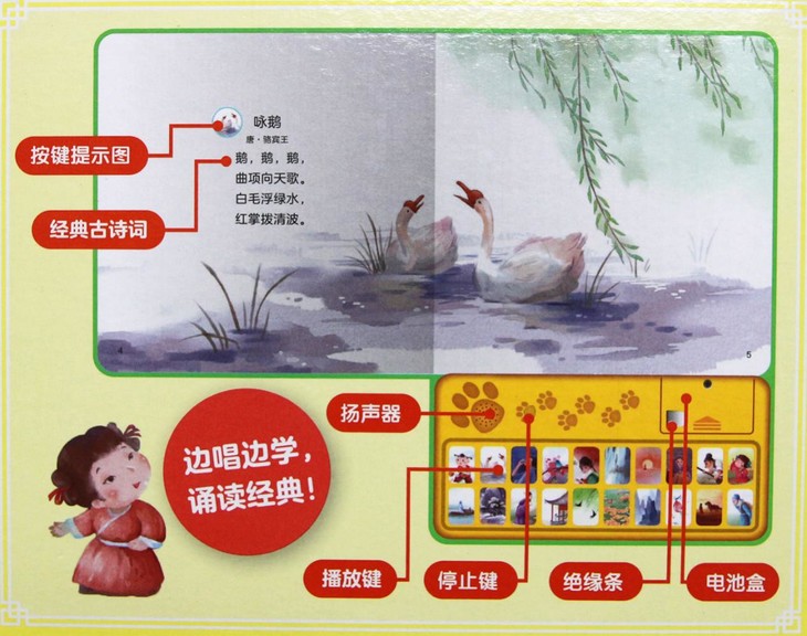 采用内嵌发声器的方式直接播放音频,不需另外在手机、电脑下载,操作更简单、方便,孩子自己轻松操作,随时随地唱学古诗词。