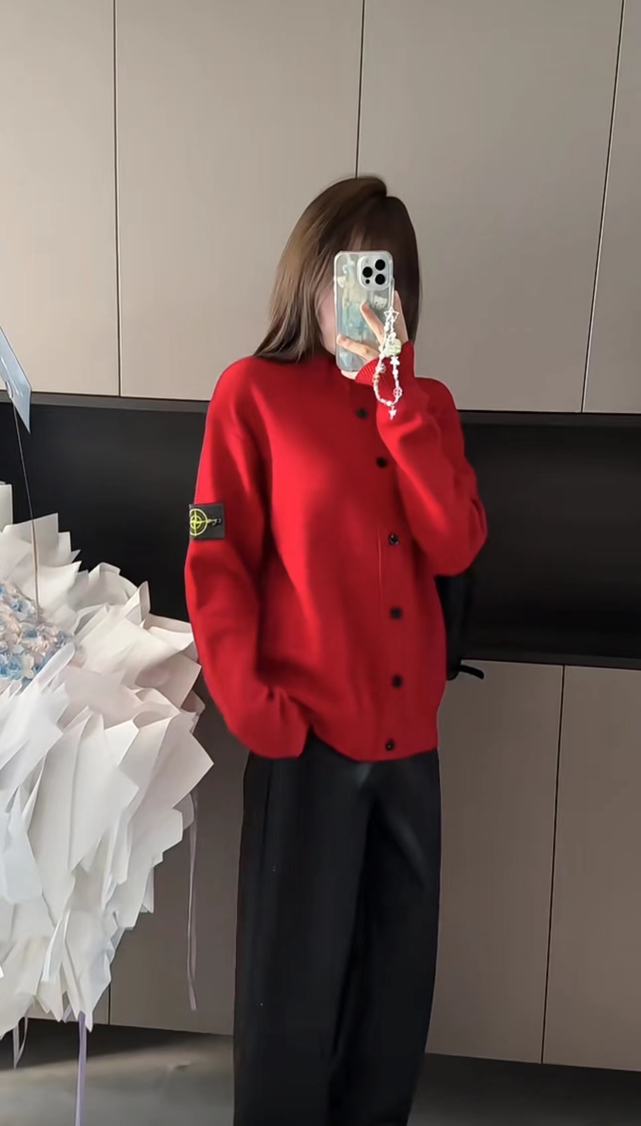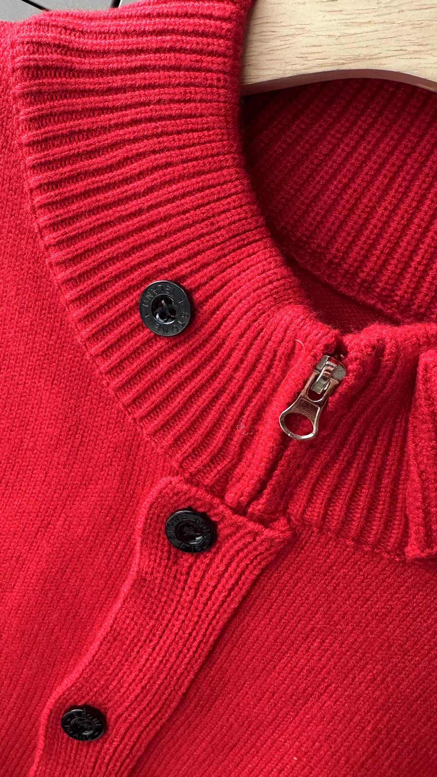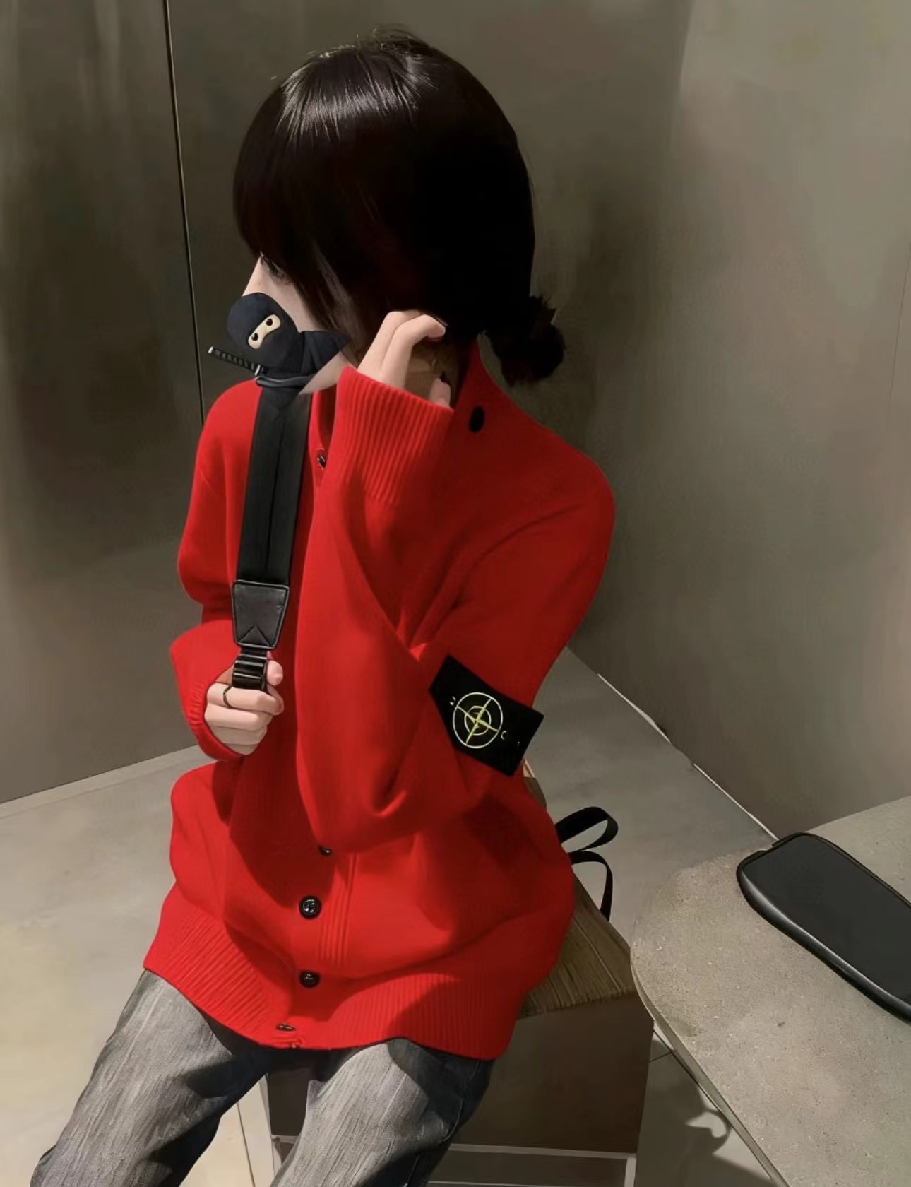 新款徽章立领拉链单排扣针织外套新年红针织开衫,兼具潮牌辨识度与节日氛围感,是日常出街和跨年穿搭的吸睛单品。采用高饱和度的正红色调,自带节日喜庆感;宽松落肩版型对身材包容度高,慵懒随性又显利落。软糯亲肤的针织面料,保暖性佳;正面是精典的黑色纽扣开合,穿脱方便;左臂上的标志性罗盘徽章,是潮牌身份的点睛之笔。单穿内搭都出彩,搭配黑色阔腿裤就很有松弛感,也可以叠穿大衣、羽绒服,轻松打造新年氛围感穿搭。