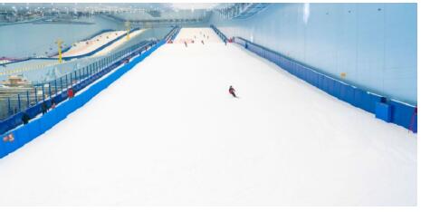 成都融创雪世界,总建筑面积约8.08万㎡,拥有7条不同等级的滑雪道和2个地形公园,最大落差达60米的雪道,最大坡度21°,满足不同级别的雪友们,全天可接待8000人滑雪。雪世界首创藏羌秘境冰雪主题,十余项精彩纷呈的娱雪项目,雪世界拥有约1.3万吨造雪量近2.1万㎡娱雪区,真冰真雪,四季恒温,为中国家庭创造一个“全龄段、全年度、全天候“的世界级冰雪乐园。