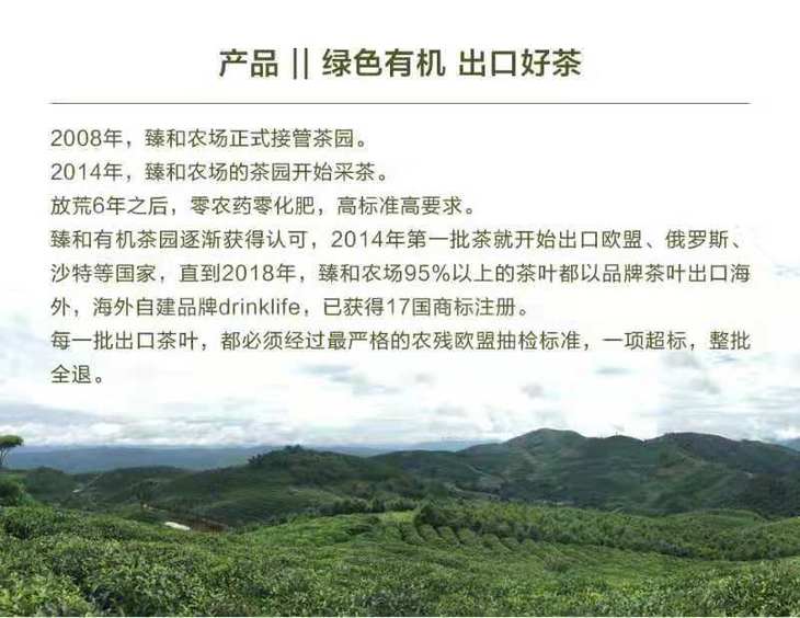 终于,臻和茶园因为0化肥0农残、高标准高要求、在业界渐渐有了名声。从2014年开始,臻和茶叶便以高品质,通过严密的国际出口检验体系,已连续多年出口沙特、俄罗斯等国家,出口量占公司总产量的95%。