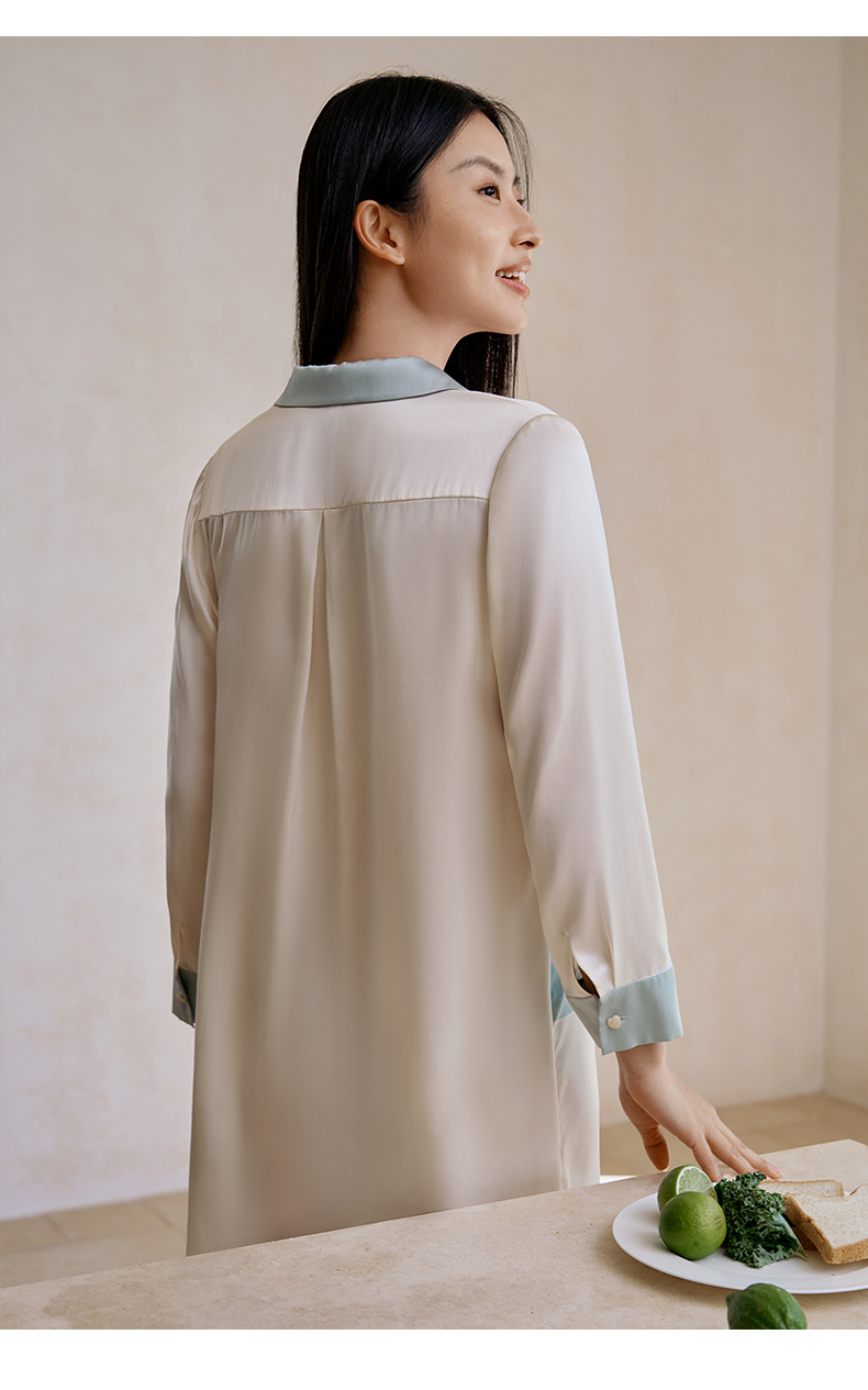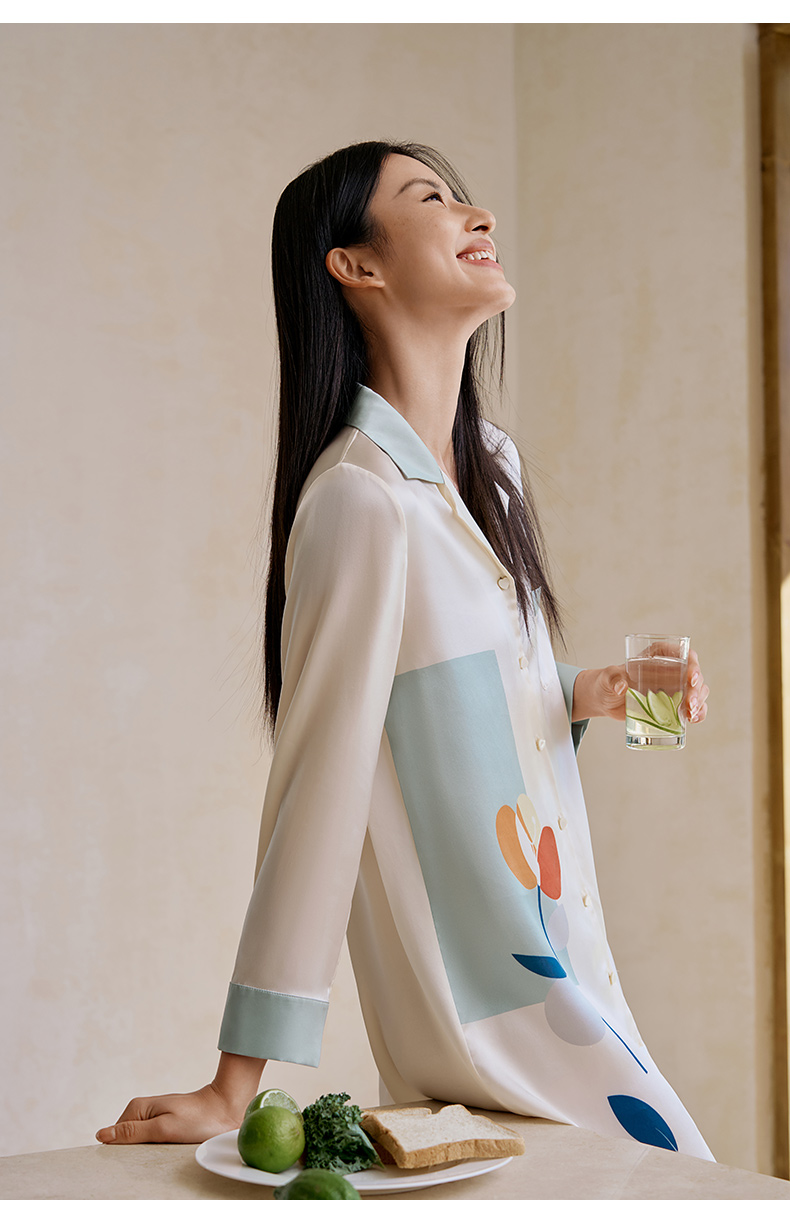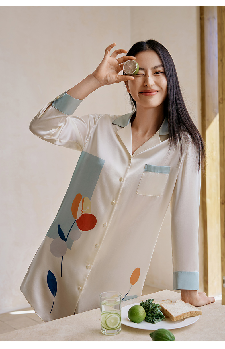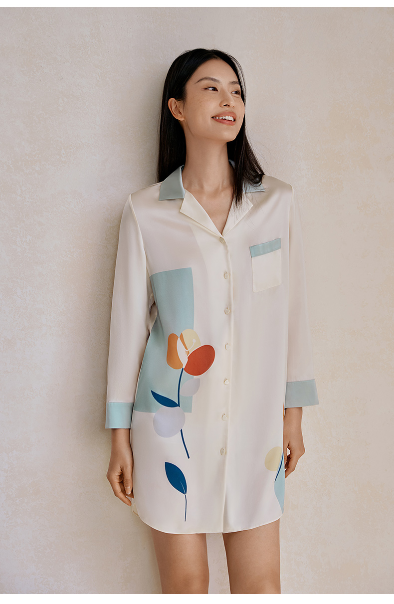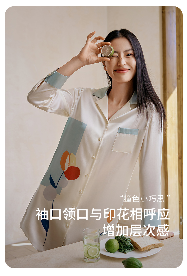 金三塔100%桑蚕丝宽松舒适真丝印花睡裙女简约衬衫裙睡衣家居服 YSFFA308